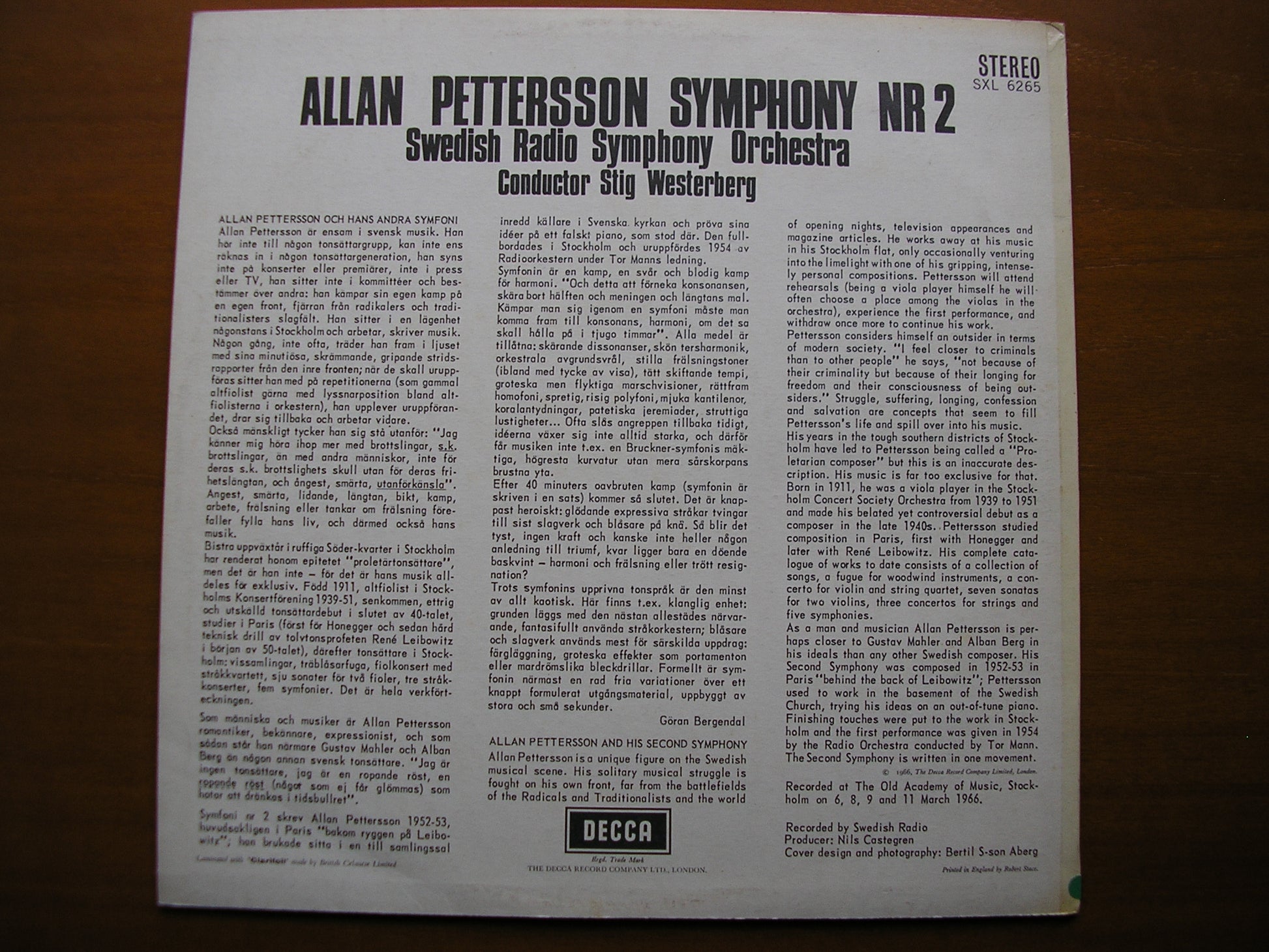 SXL 6265 ALLAN PETTERSSON: SYMPHONY No. 6     STIG WESTERBERG / SWEDISH RADIO ORCHESTRA