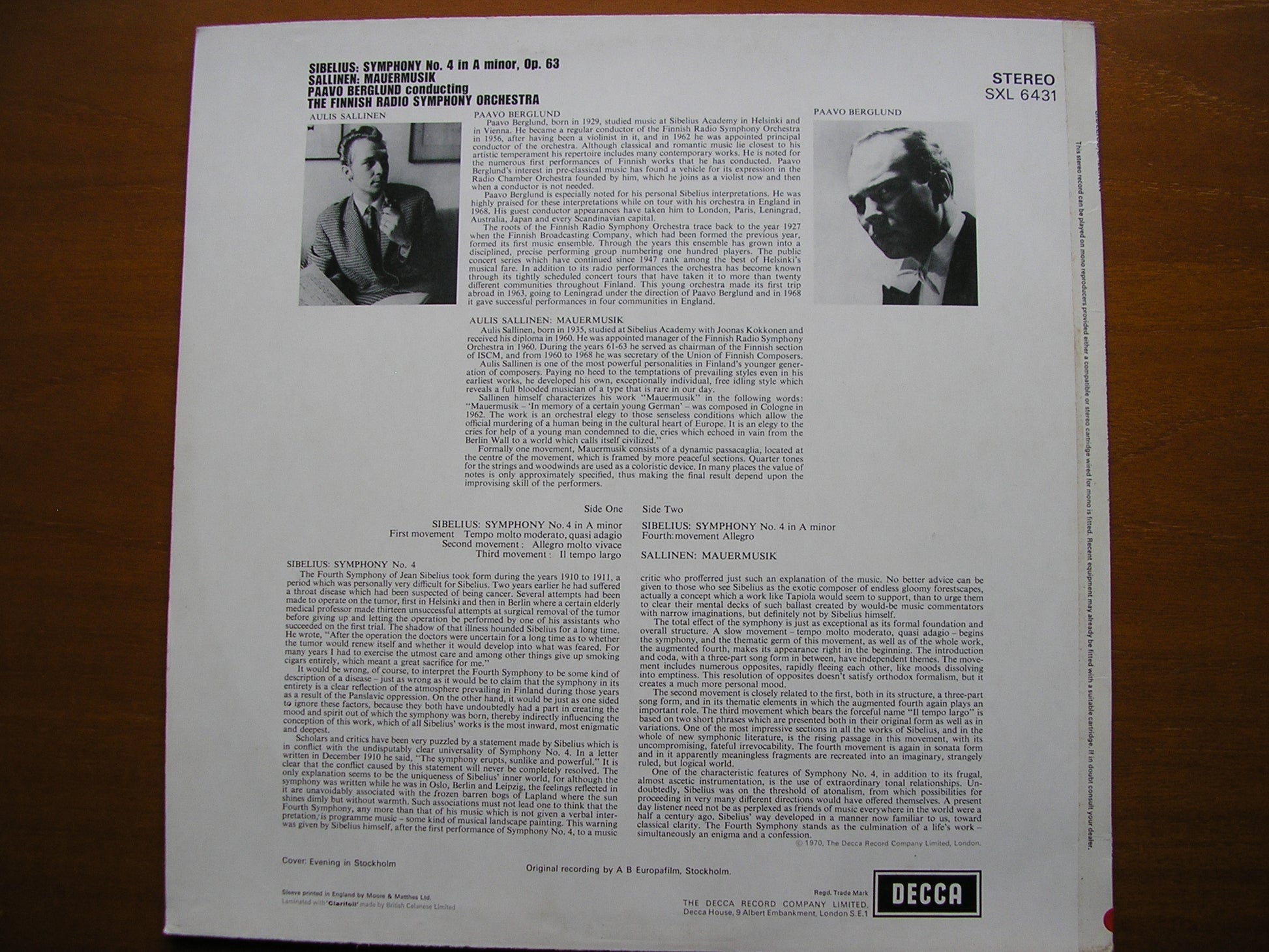 SXL 6431 SIBELIUS: SYMPHONY No. 4 / SALLINEN: MAUERMUSIK     PAAVA BERGLUND / FINNISH RADIO SYMPHONY ORCHESTRA