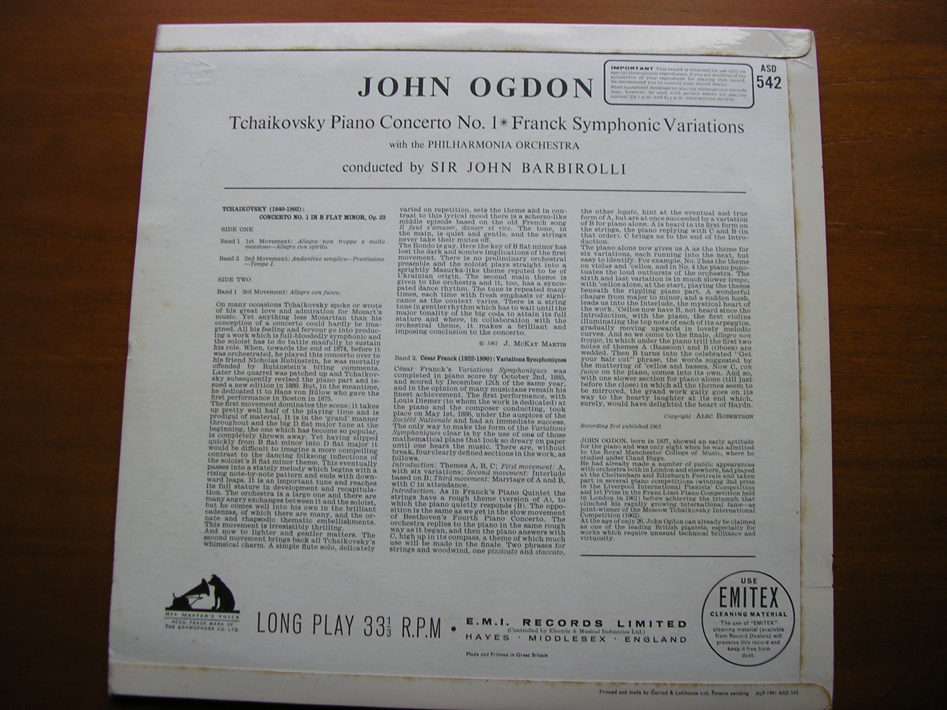 ASD 542  TCHAIKOVSKY: PIANO CONCERTO No. 1 / FRANCK: SYMPHONIC VARIATIONS    JOHN OGDON / PHILHARMONIA ORCHESTRA / SIR JOHN BARBIROLLI