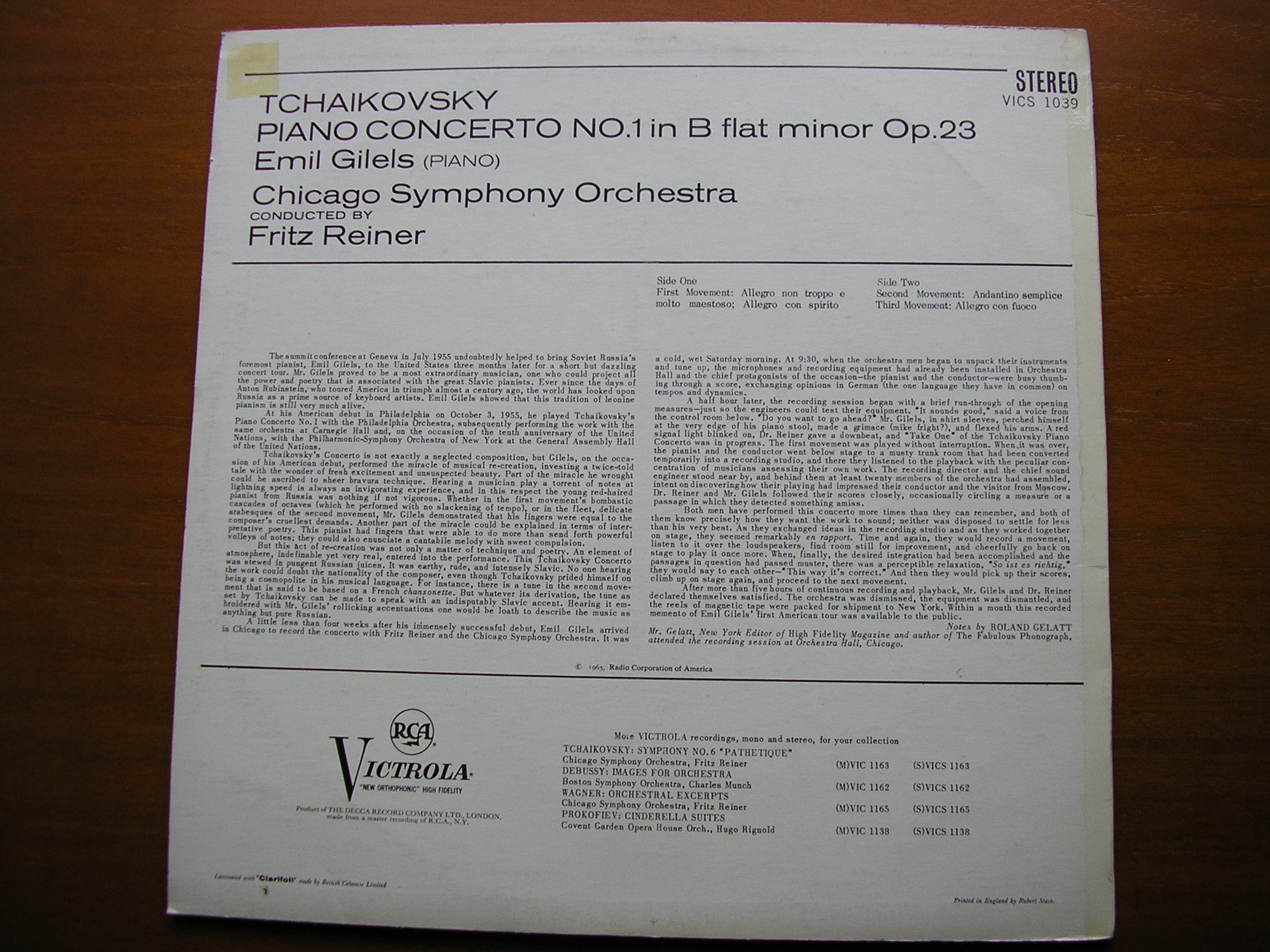 TCHAIKOVSKY: PIANO CONCERTO No. 1 GILELS / CHICAGO SYMPHONY / REINER VICS 1039