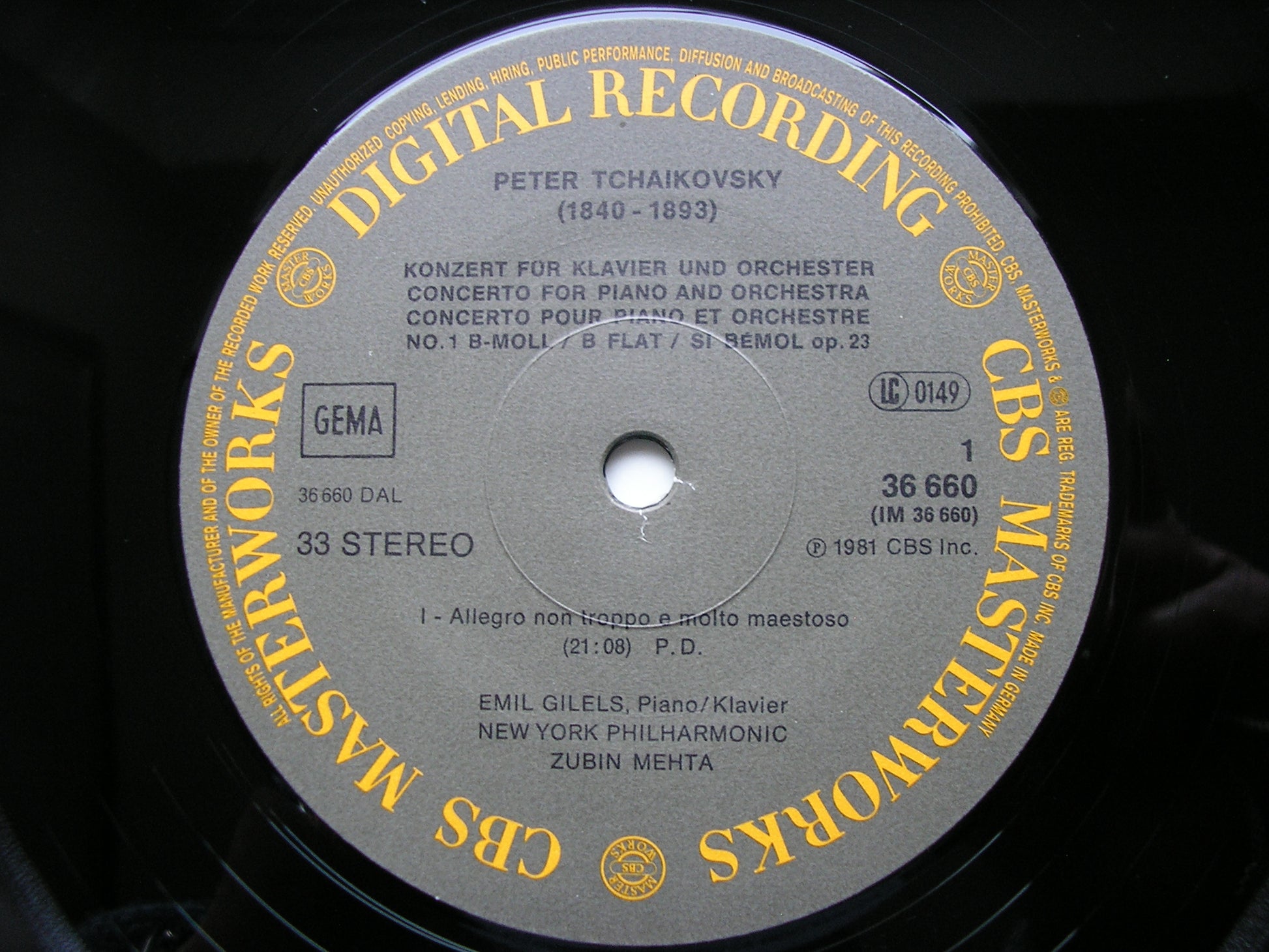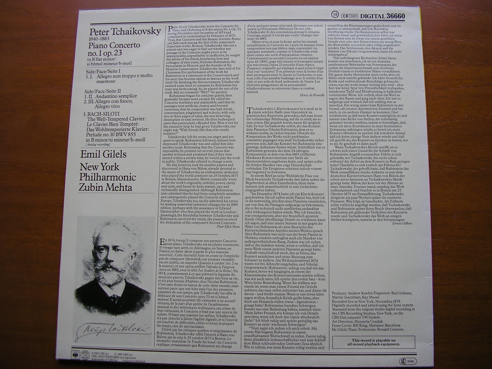 36660  TCHAIKOVSKY: PIANO CONCERTO No. 1 / BACH-SILOTI: Prelude No. 10 BWV 855    EMIL GILELS / NEW YORK PHILHARMONIC ORCHESTRA / ZUBIN MEHTA