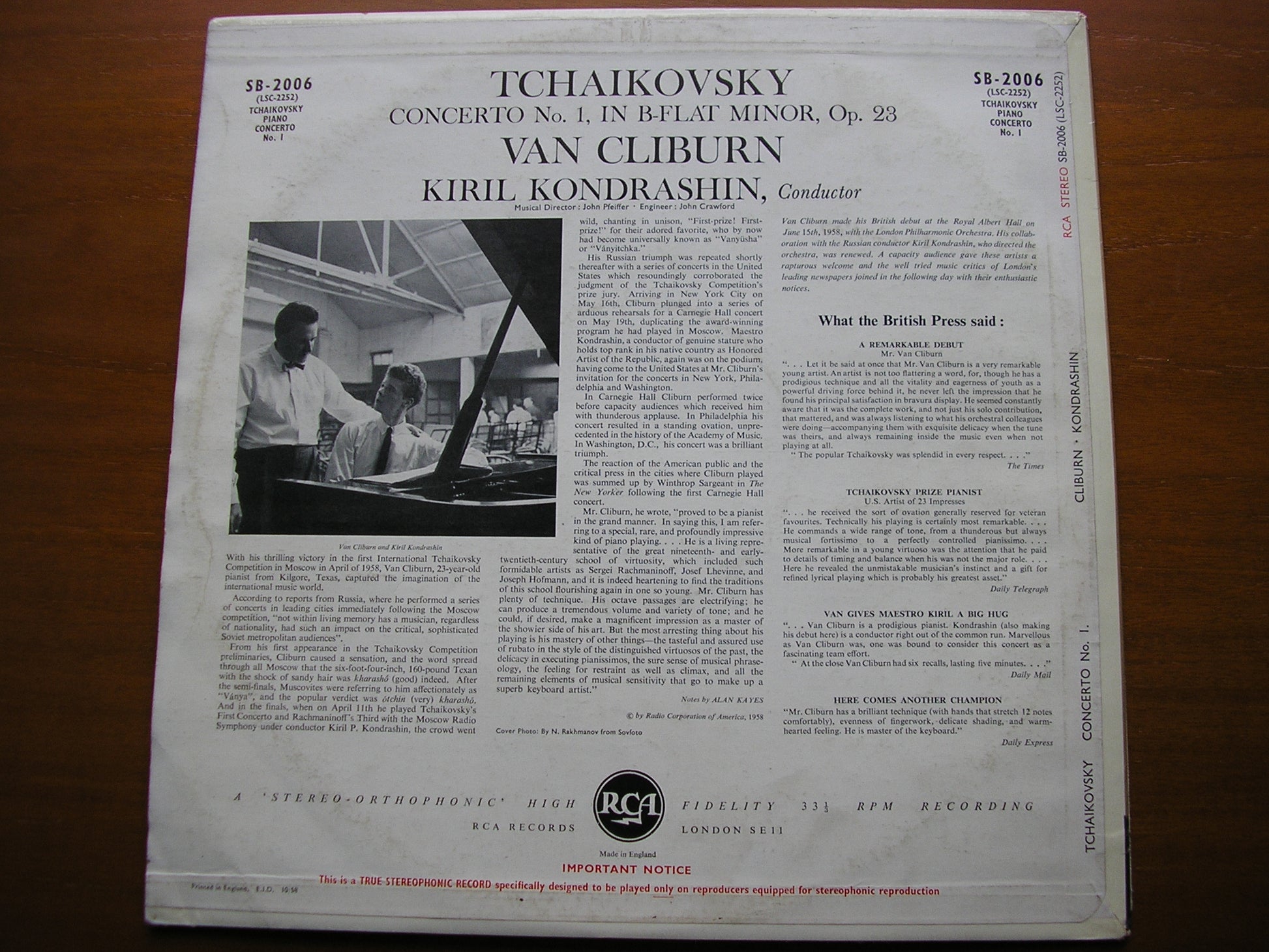 TCHAIKOVSKY: PIANO CONCERTO No. 1 VAN CLIBURN / RCA SYMPHONY ORCHESTRA / KONDRASHIN SB 2006
