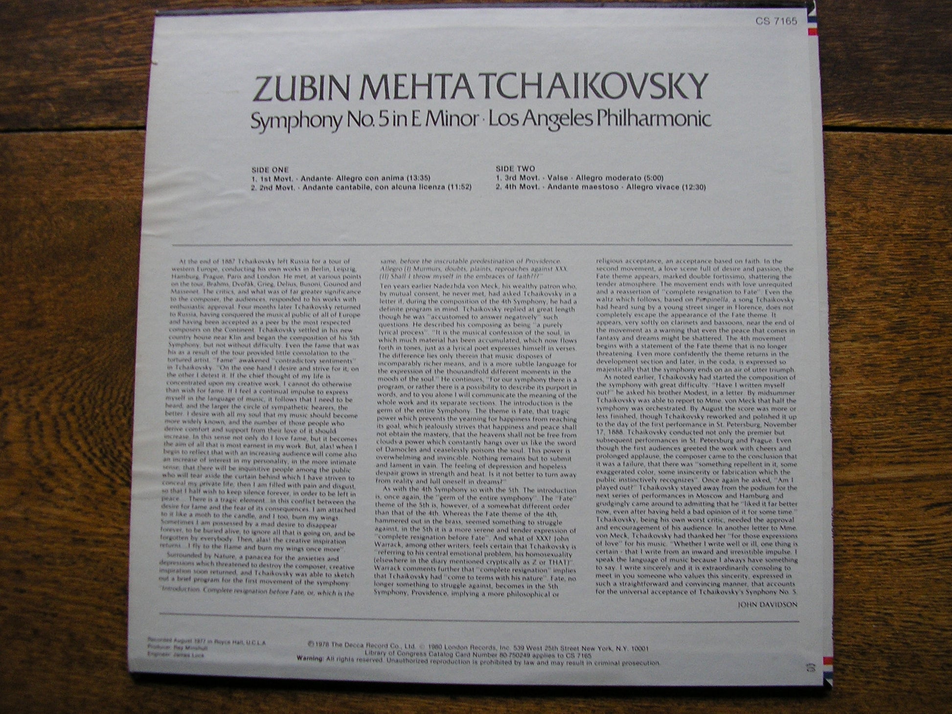 CS 7165  TCHAIKOVSKY: SYMPHONY No. 5   ZUBIN MEHTA / LOS ANGELES PHILHARMONIC ORCHESTRA