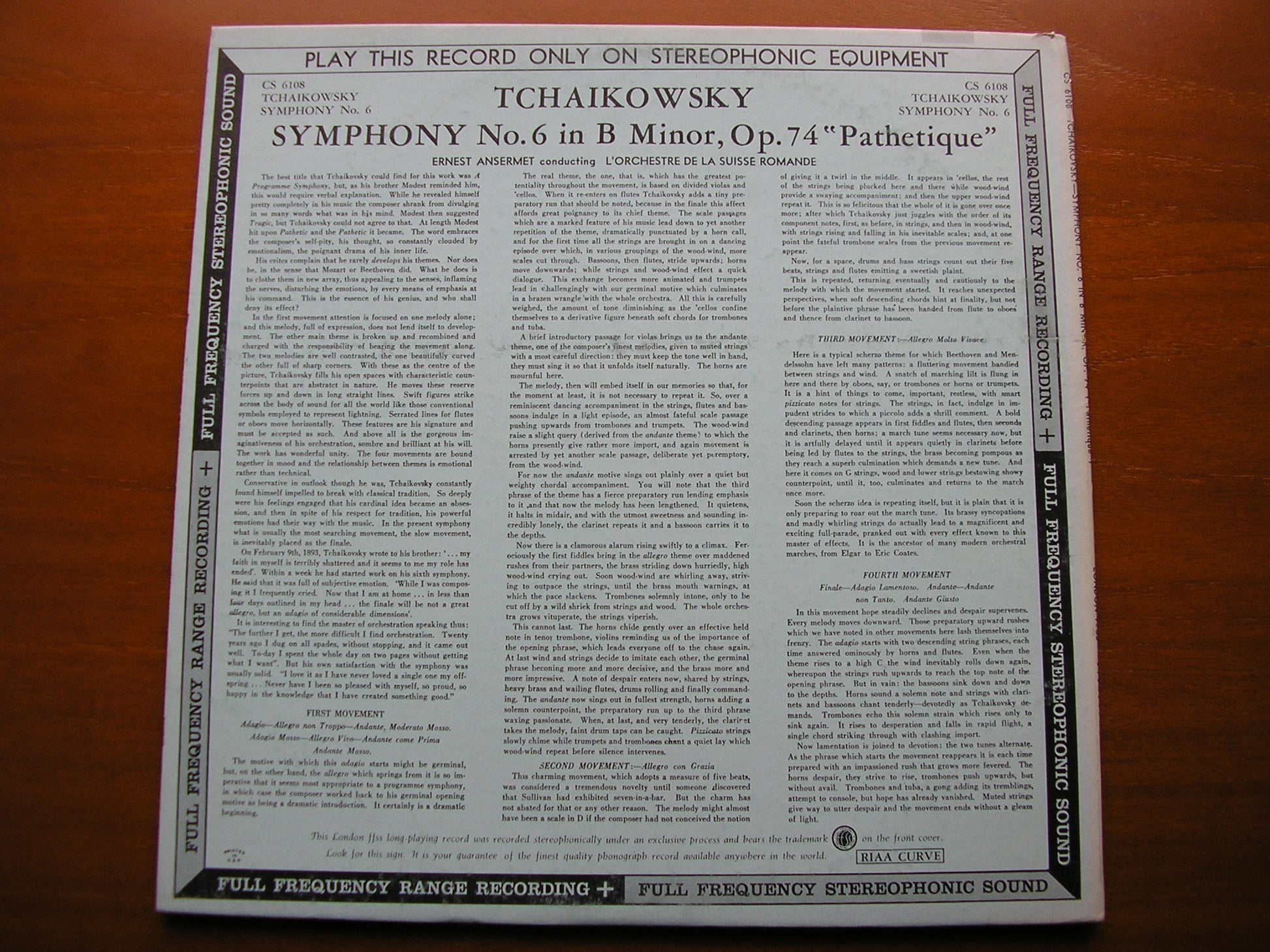 TCHAIKOVSKY: SYMPHONY No. 6 ANSERMET / SUISSE ROMANDE ORCHESTRA CS 6108