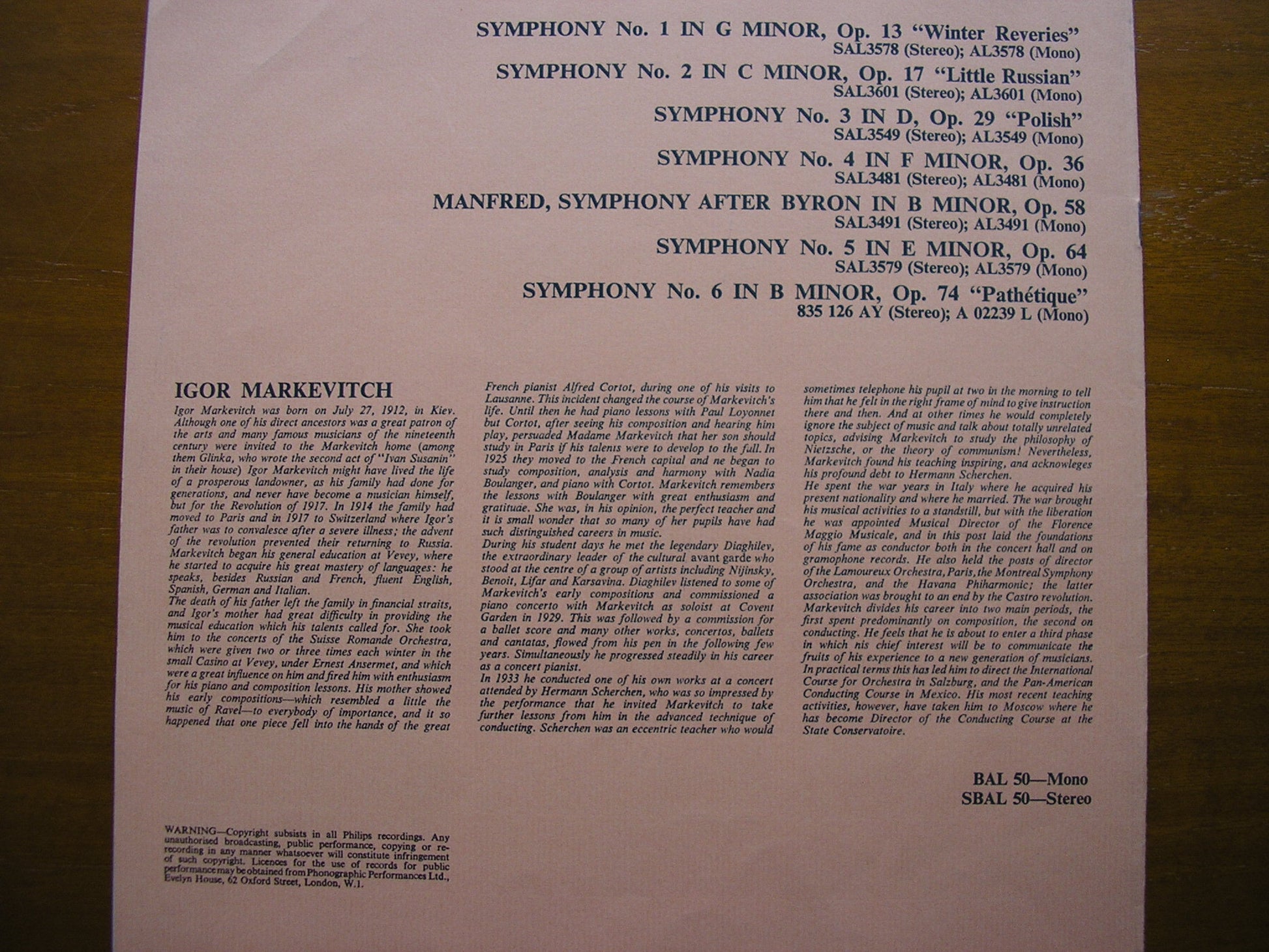 SBAL 50  TCHAIKOVSKY: THE SYMPHONIES   IGOR MARKEVITCH / LONDON SYMPHONY ORCHESTRA