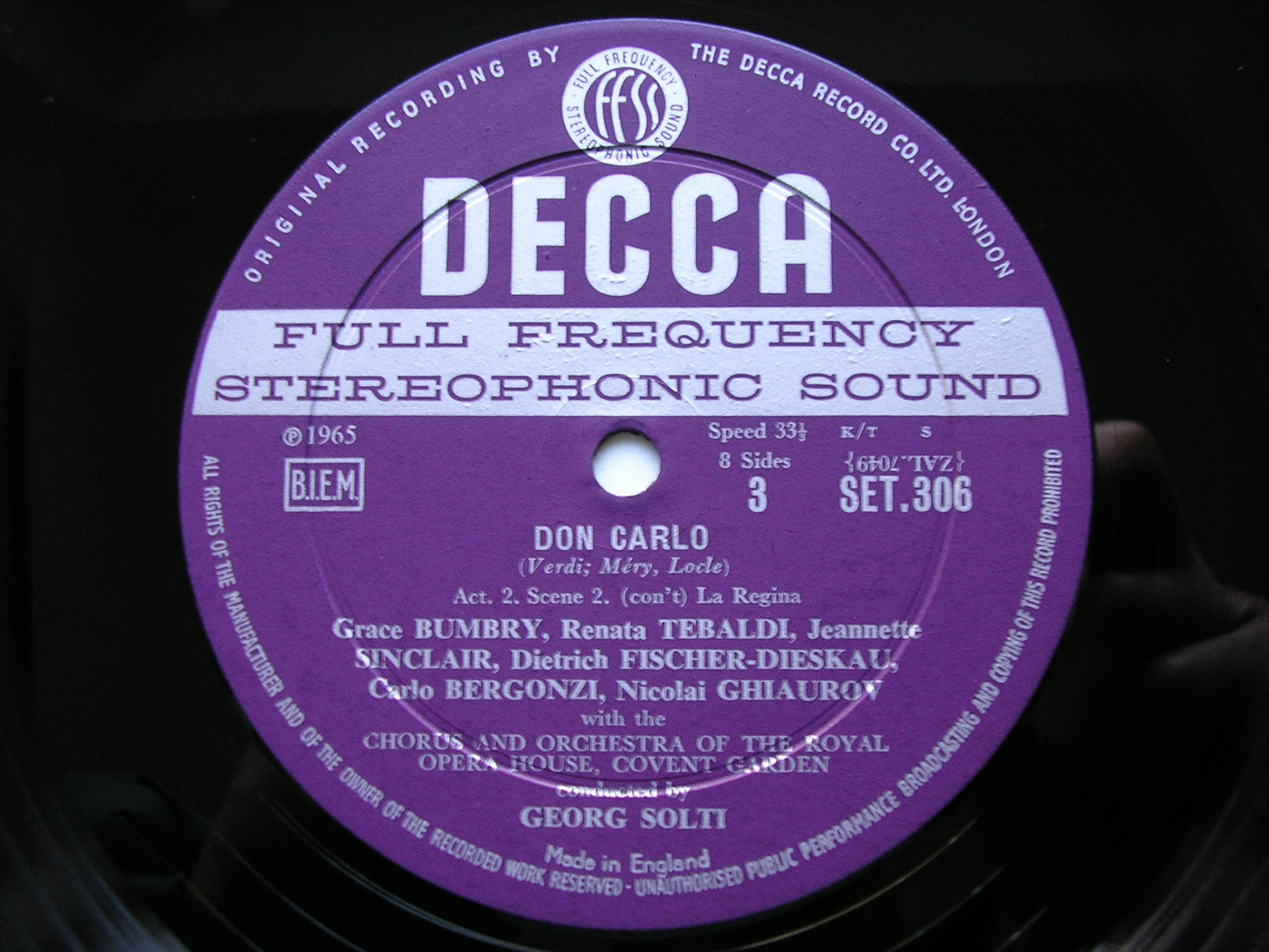 VERDI: DON CARLO - BERGONZI / TEBALDI / GHIAUROV / BUMBRY / FISCHER-DIESKAU / OROHCG / SOLTI SET 305 - 8