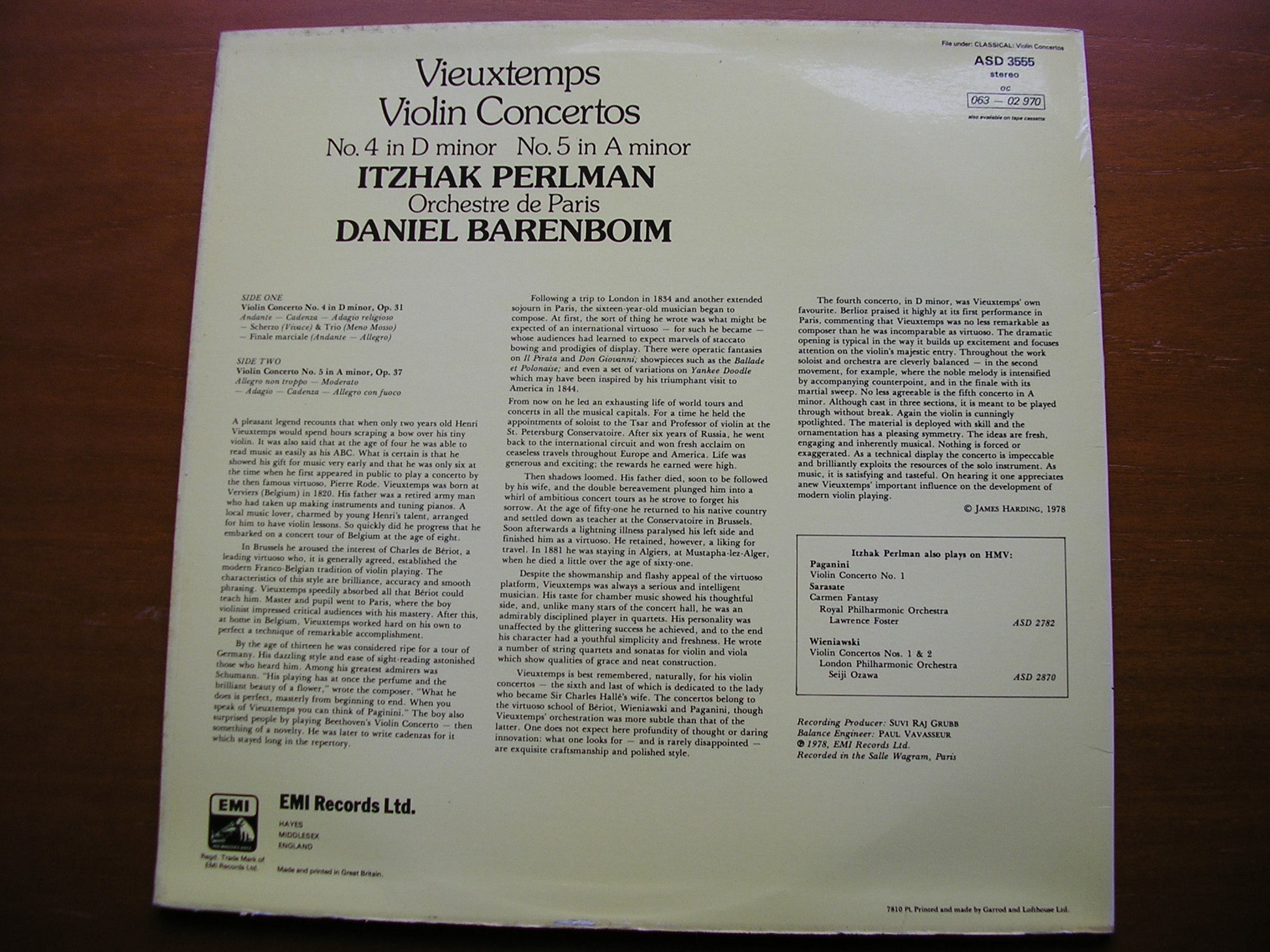 ASD 3555  VIEUXTEMPS: VIOLIN CONCERTOS Nos. 4 & 5    ITZHAK PERLAN / ORCHESTRE de PARIS / DANIEL BARENBOIM