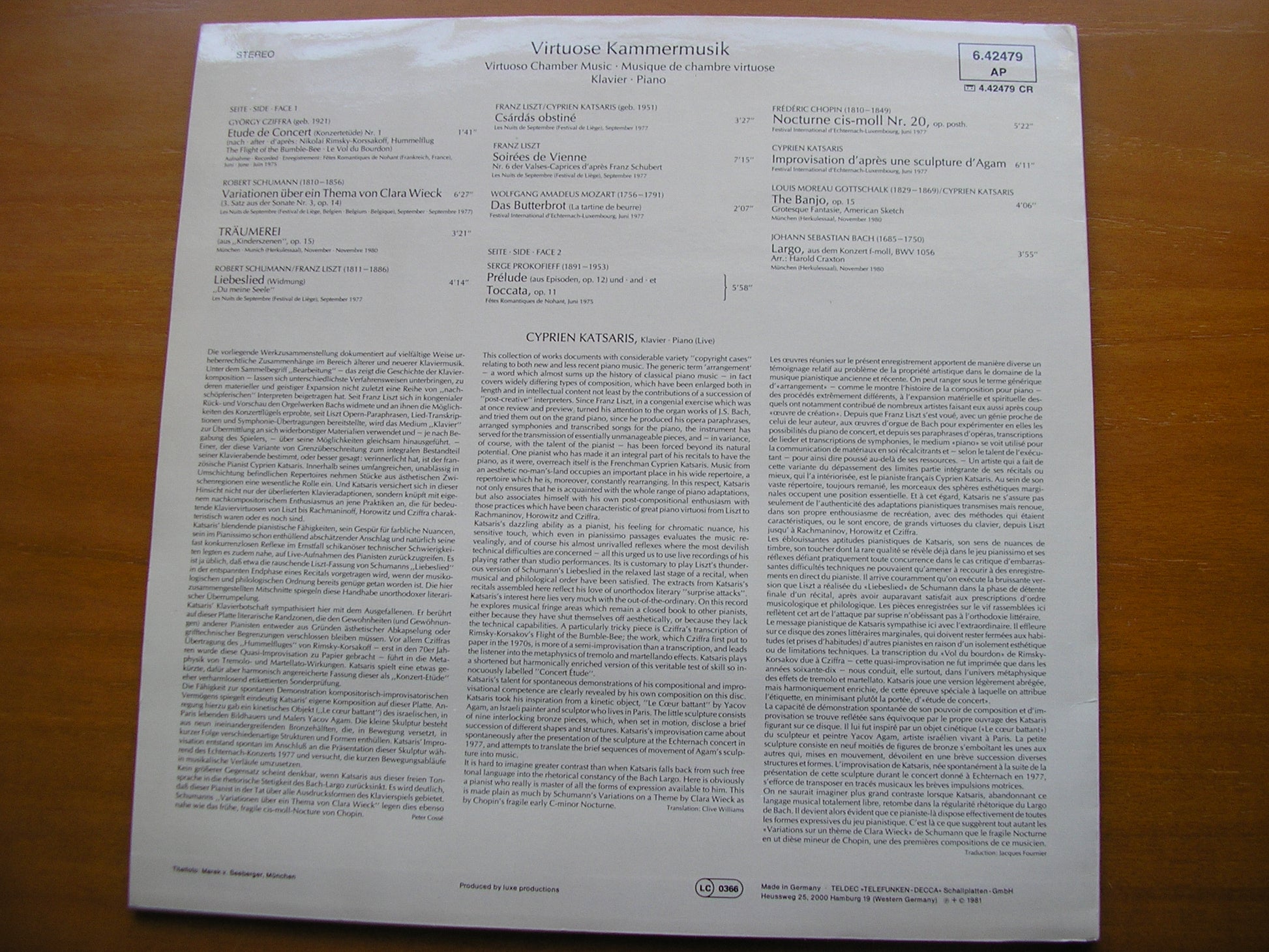 6.42479  BACH / CHOPIN / GOTTSCHAK / LISZT / SCHUMANN / CZIFFRA / MOZART / KATSARIS: PIANO WORKS        CYPRIEN KATSARIS