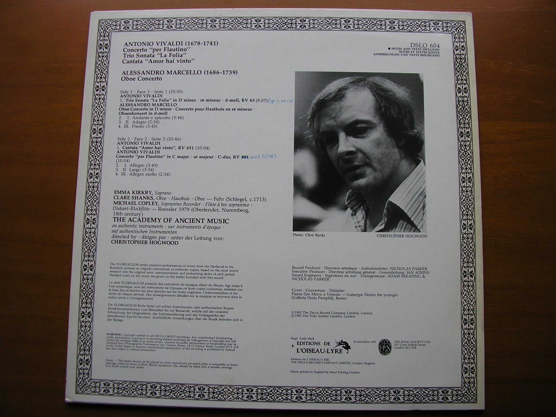 DSLO 604  VIVALDI: CONCERTO / TRIO SONATA / CANTATA 'Amor hai vinto' & MARCELLO: OBOE CONCERTO       EMMA KIRKBY / CLARE SHANKS / MICHAEL COPLEY / THE ENGLISH CONCERT / TREVOR PINNOCK