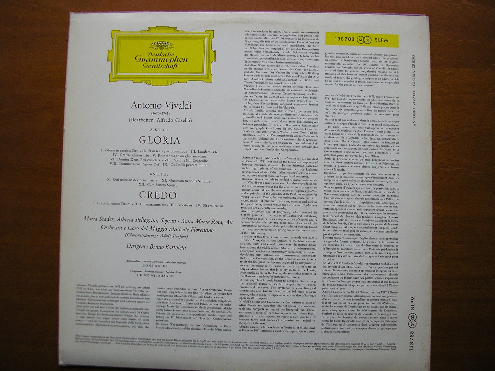 138 788  VIVALDI: GLORIA & CREDO    MARIA STADER / ALBERTA PELLEGRINI / ANNA MARIA ROTA / MAGGIO MUSICALE FIORENTINO / BRUNO BARTOLETTI