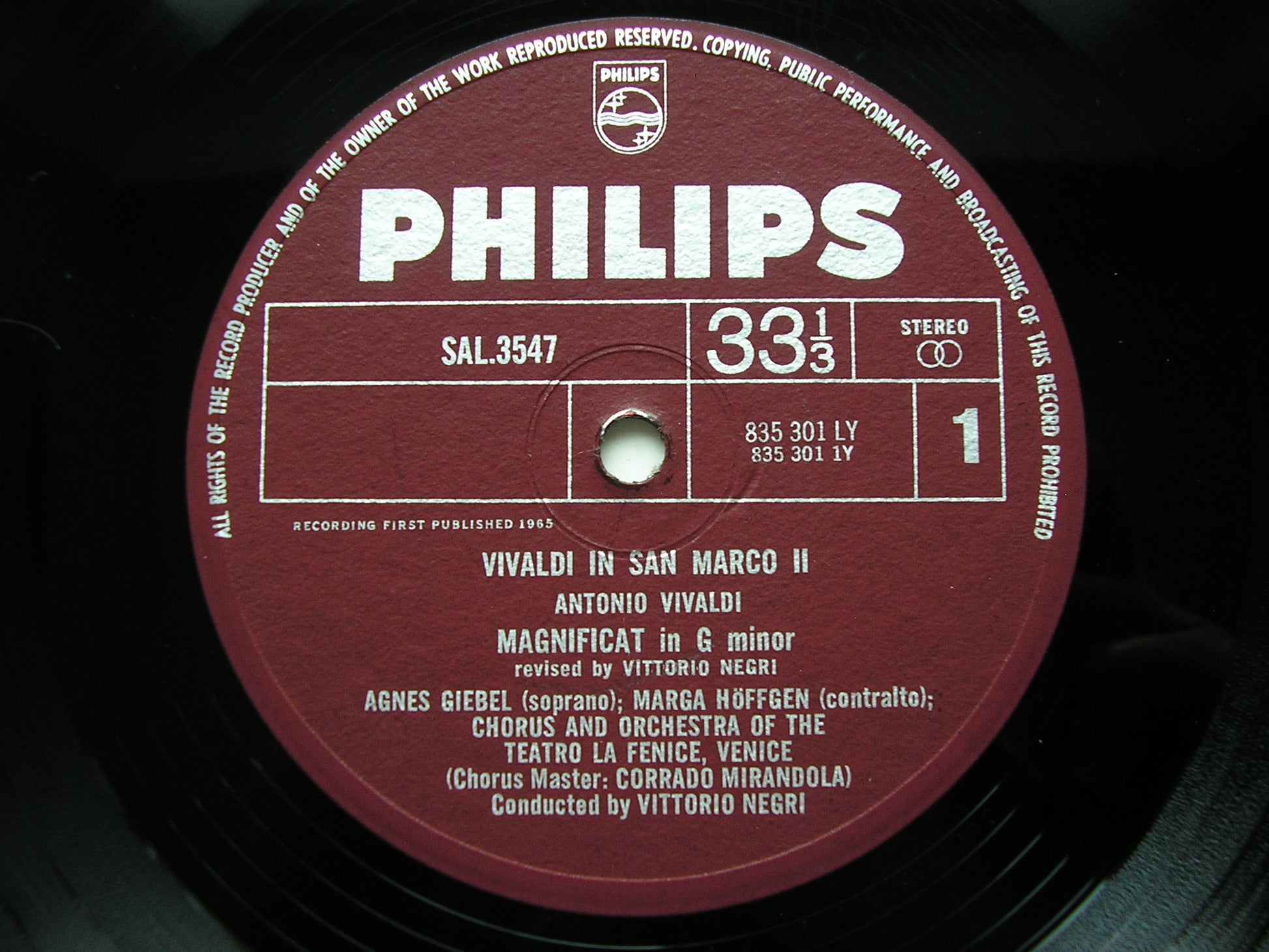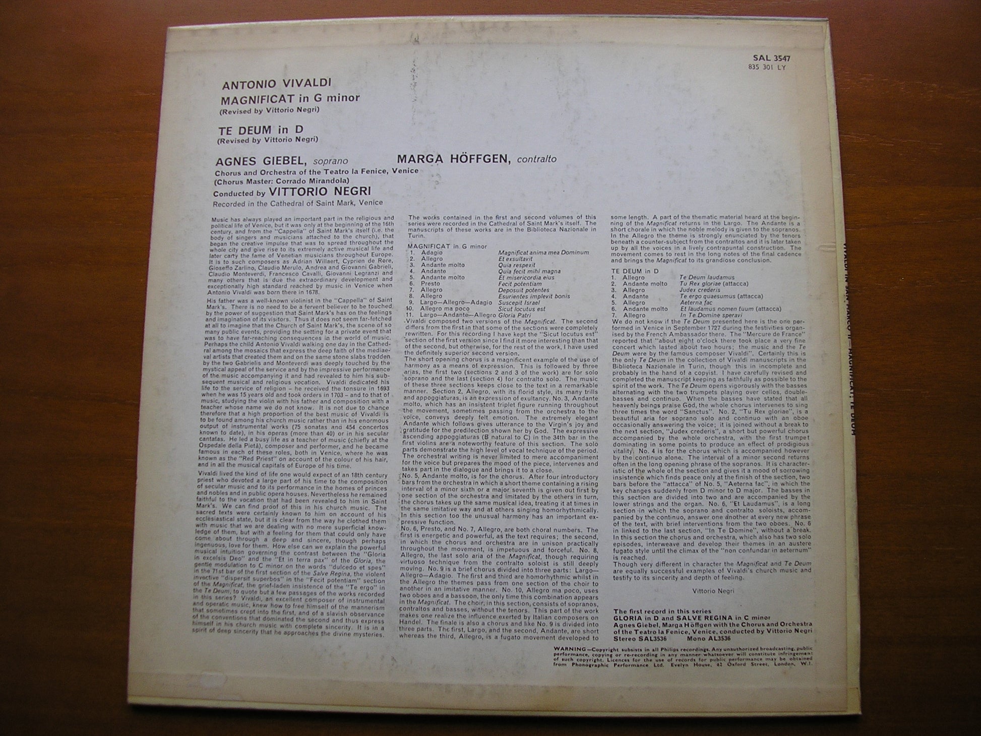 SAL 3547  VIVALDI: MAGNIFICAT / TE DEUM       AGNES GIEBEL / MARGA HOFFGEN / LA FENICE ORCHESTRA / VITTORIO NEGRI