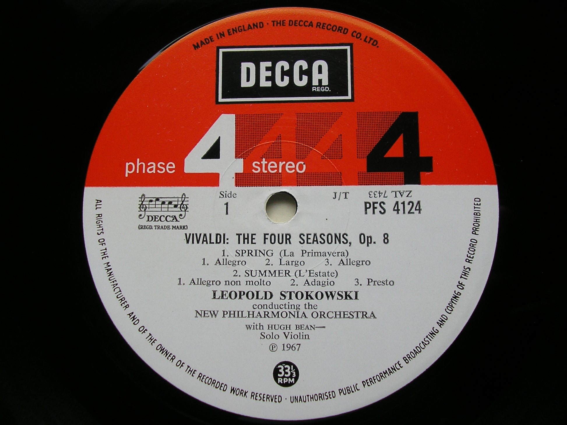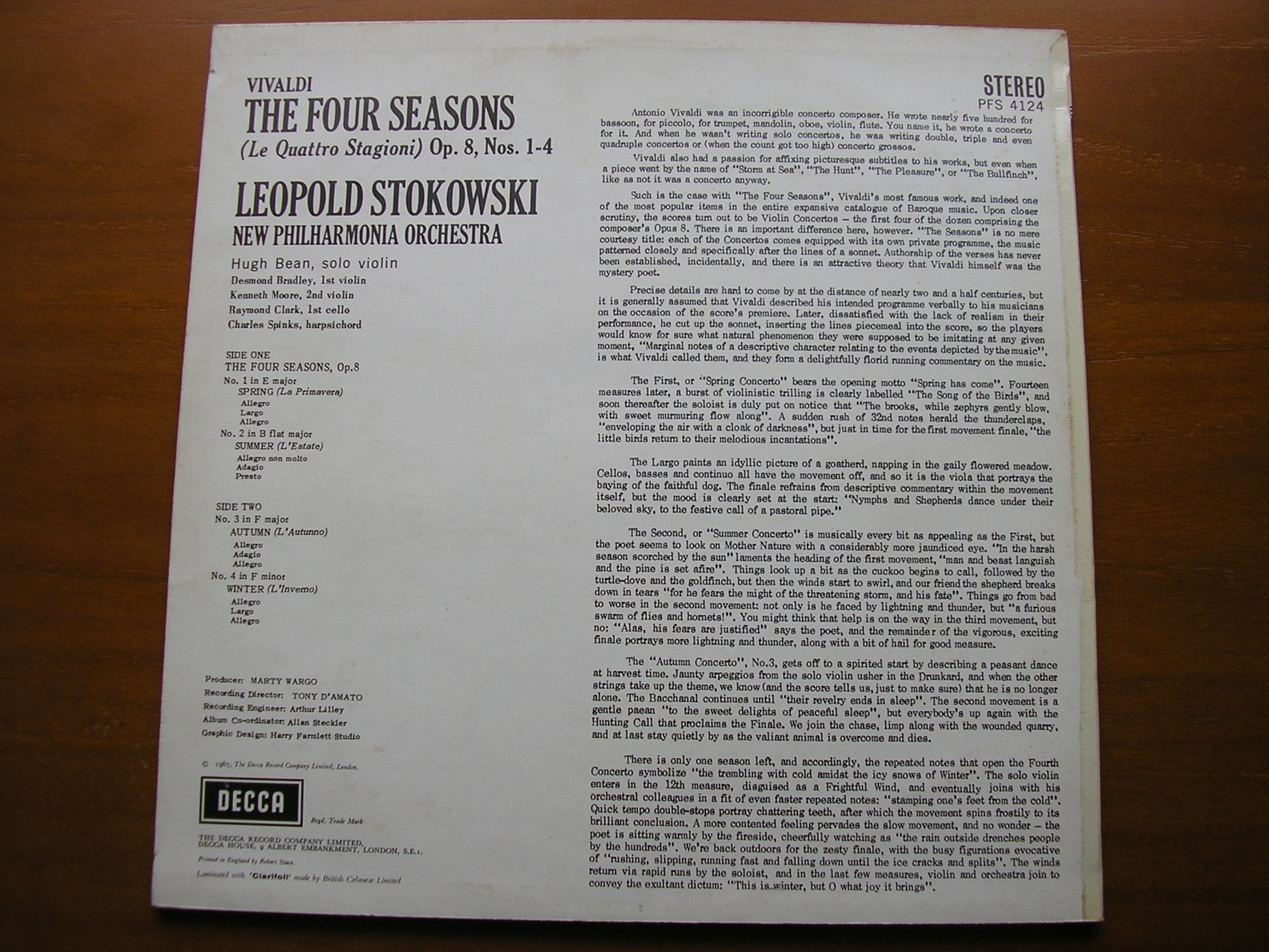 PFS 4124  VIVALDI: THE FOUR SEASONS      HUGH BEAN / NEW PHILHARMONIA ORCHESTRA / LEOPOLD STOKOWSKI