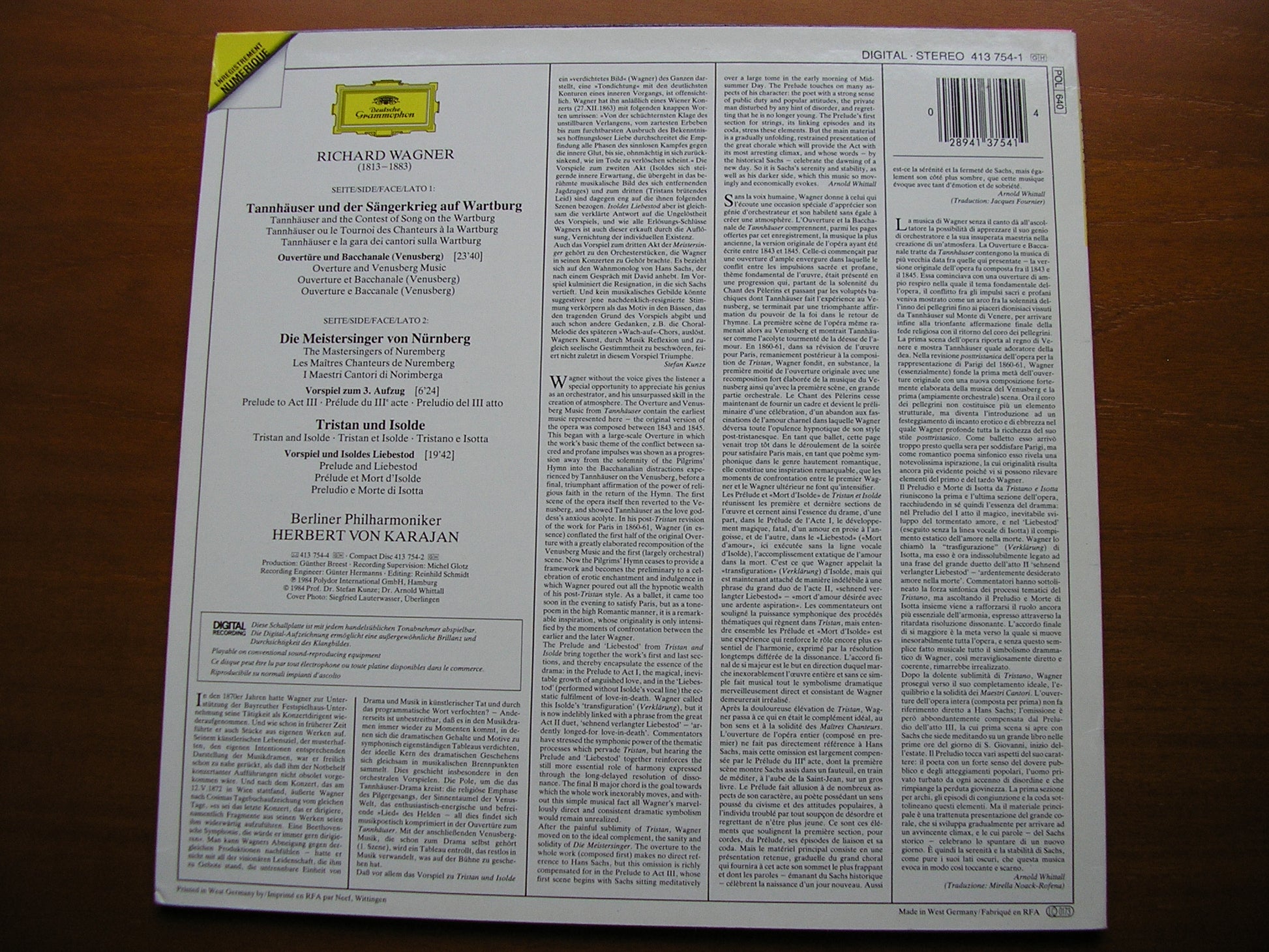 413 754  WAGNER: TANNHAUSER Overture & Venusberg Music / DIE MEISTERSINGER Prelude to Act 3 / TRISTAN & ISOLDE Prelude & Liebestod    HERBERT VON KARAJAN / BERLIN PHILHARMONIC ORCHESTRA