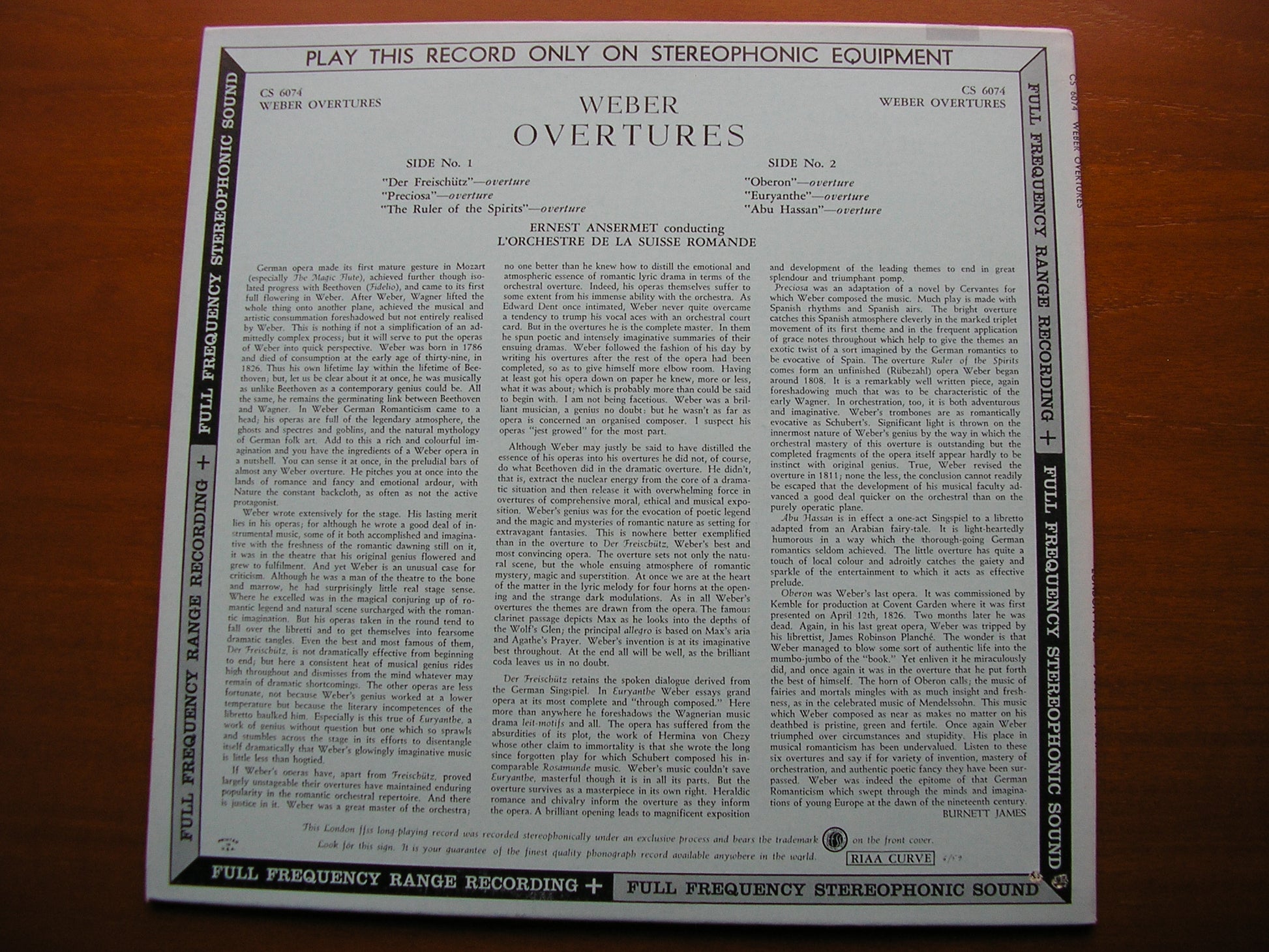 CS 6074  WEBER: OVERTURES Oberon / Abu Hassan / Preciosa / Euryanthe / The Ruler of the Spirits / Der Freischutz    ERNEST ANSERMET / SUISSE ROMANDE ORCHESTRA