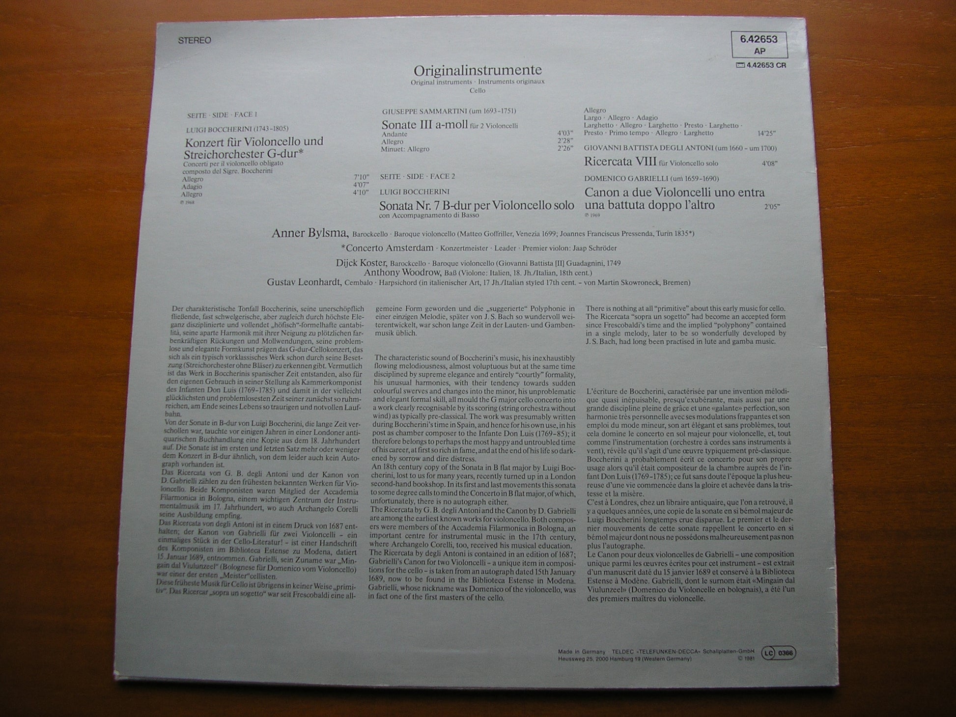 WORKS FOR CELLO: BOCCHERINI / SAMMARTINI / DEGLI ANTONI / GABRIELLI ANNER BYLSMA / CONCERTO AMSTERDAM / SCHRODER 6.42653
