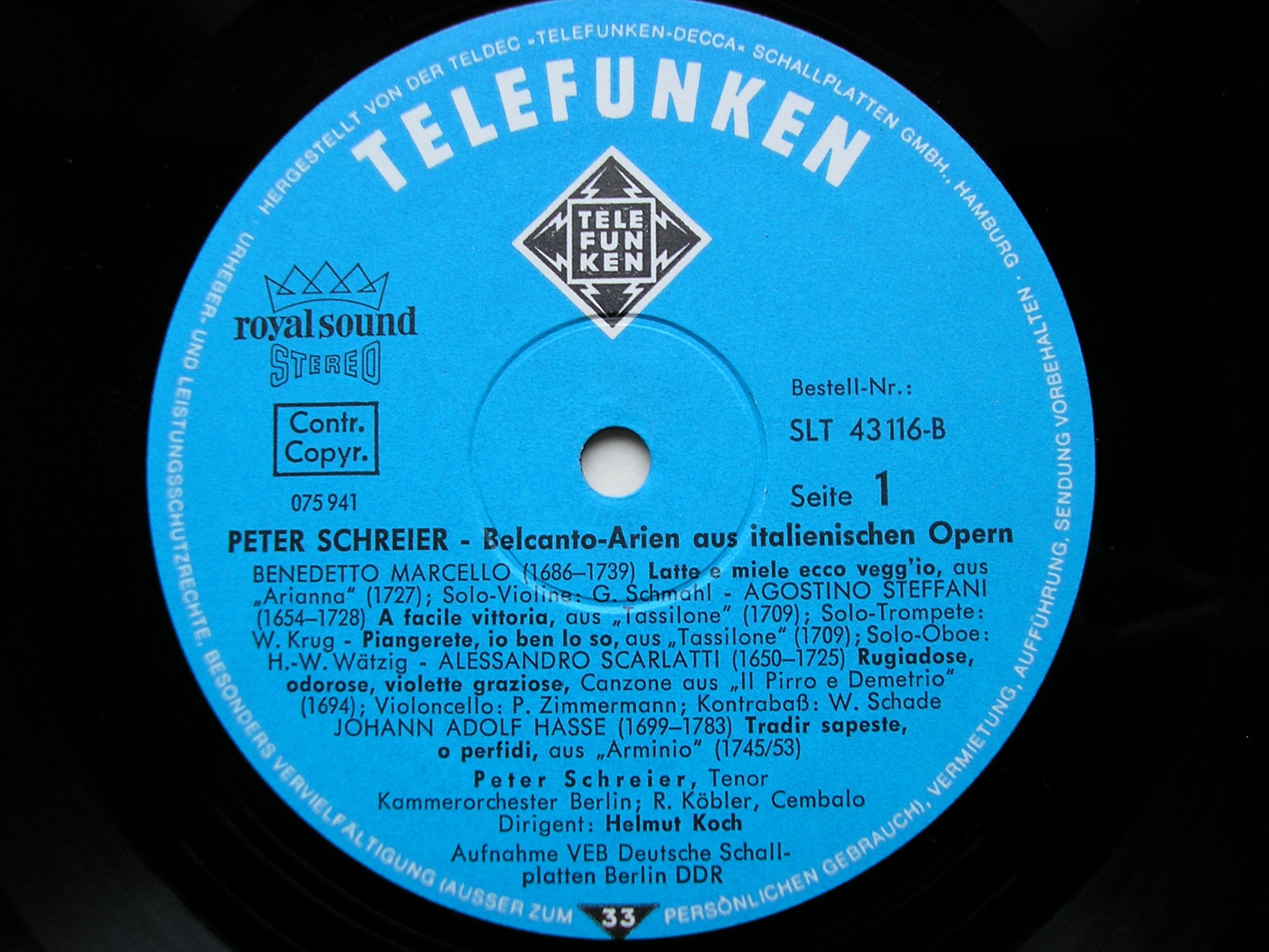 SLT 43116  BEL CANTO ARIAS: STEFFANI / GALUPPI / LEO / HASSE / GASPARINI / MARCELLO / TELEMANN / MONTEVERDI       PETER SCHREIER / BERLIN CHAMBER ORCHESTRA / HELMUT KOCH