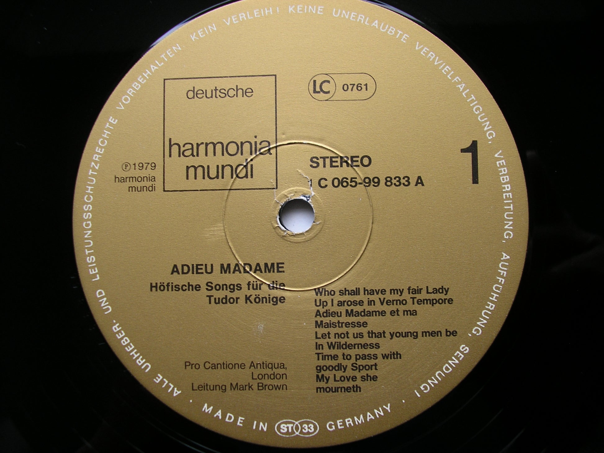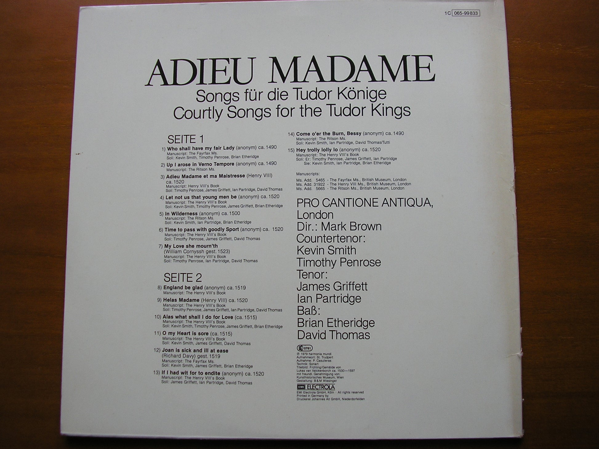 065-99 833  ADIEU MADAME: SONGS BY HENRY VIII / CORNYSH / DAVY / ANON      SOLOISTS / PRO CANTIONE ANTIQUA / MARK BROWN