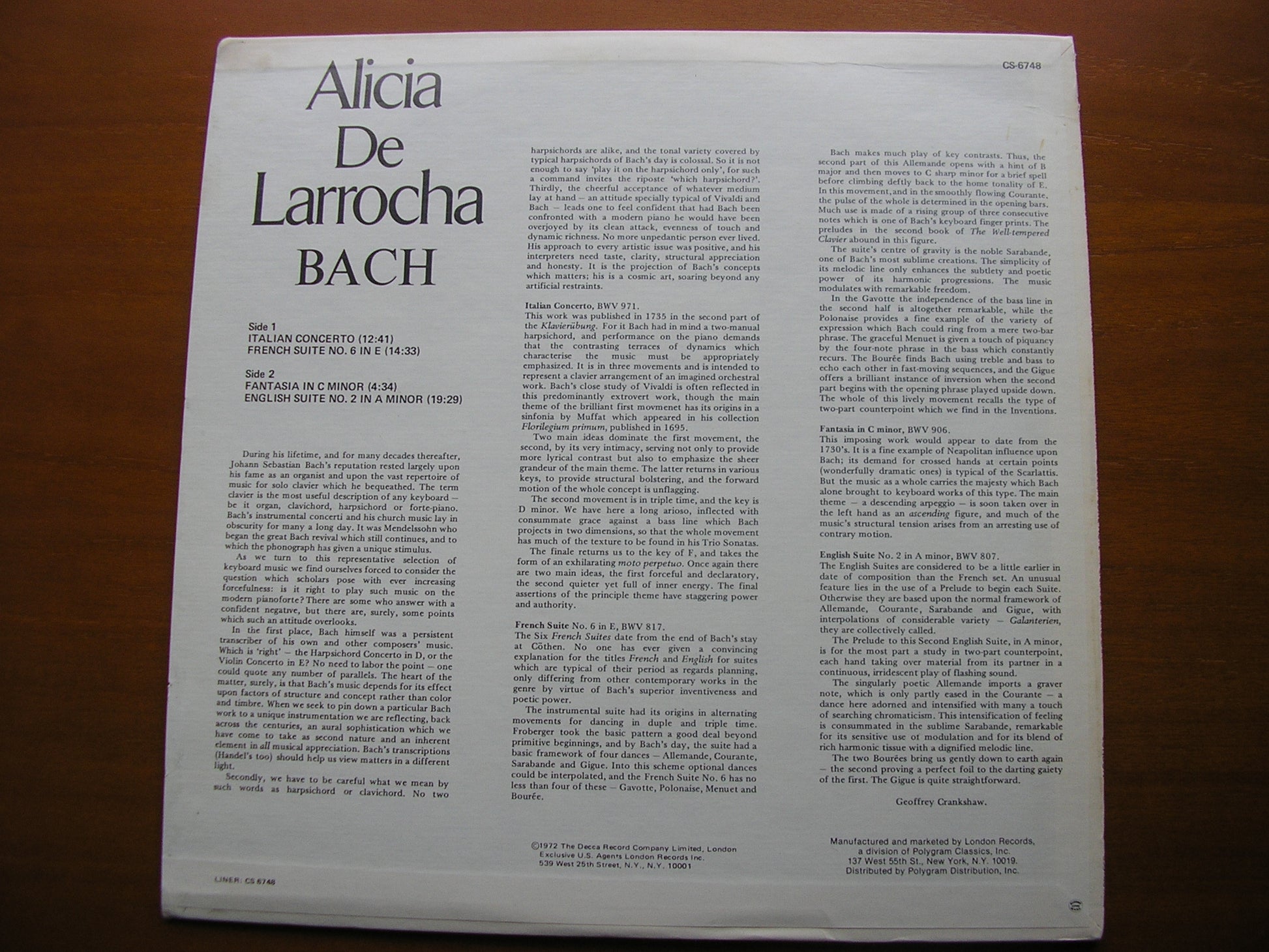 ALICIA DE LARROCHA PLAYS BACH: ITALIAN CONCERTO / FANTASIA / FRENCH SUITE No. 6 /ENGLISH SUITE No. 2 CS 6748