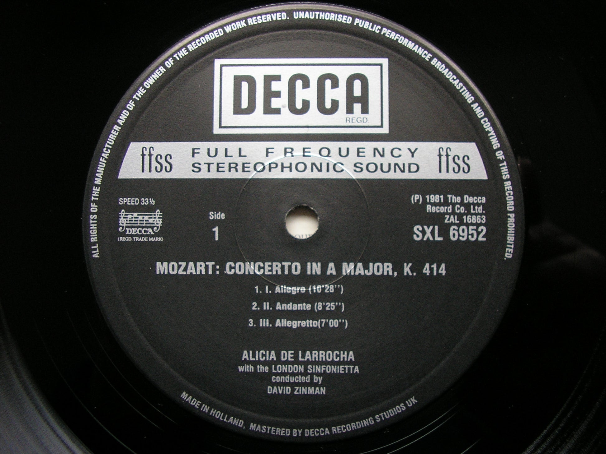 SXL 6952  MOZART: PIANO CONCERTO No. 12  K414 / HAYDN: CONCERTO in D Hob. XV111/11 / BACH: CONCERTO in F BWV 1056   ALICIA DE LARROCHA / LONDON SINFONIETTA / DAVID ZINMAN