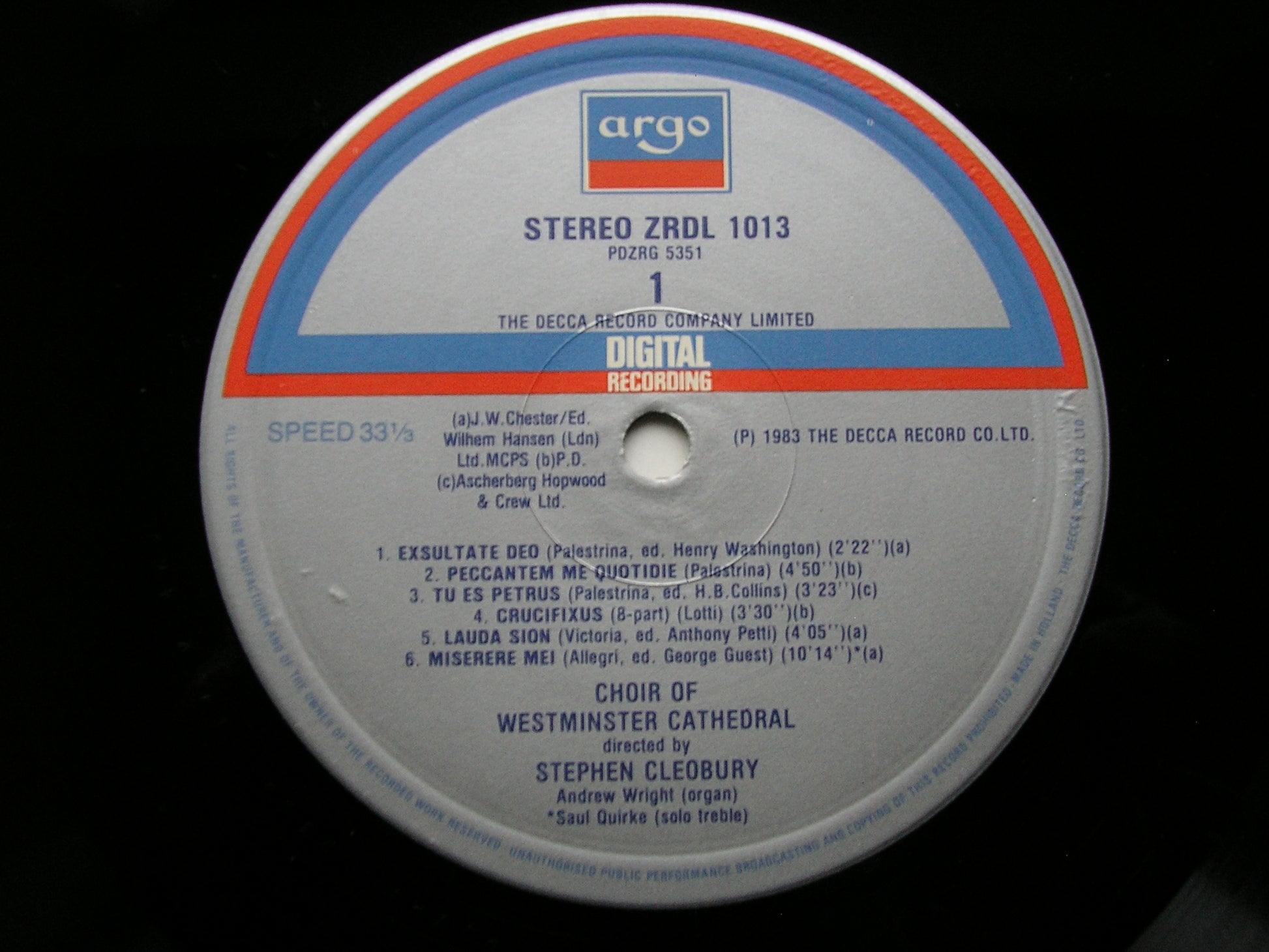 ZRDL 1013  ALLEGRI / PALESTRINA / VICTORIA / MONTEVERDI / LOTTI / AVALLI / GABRIELI: CHURCH MUSIC    CHOIR OF WESTMINSTER CATHEDRAL / STEPHEN CLEOBURY