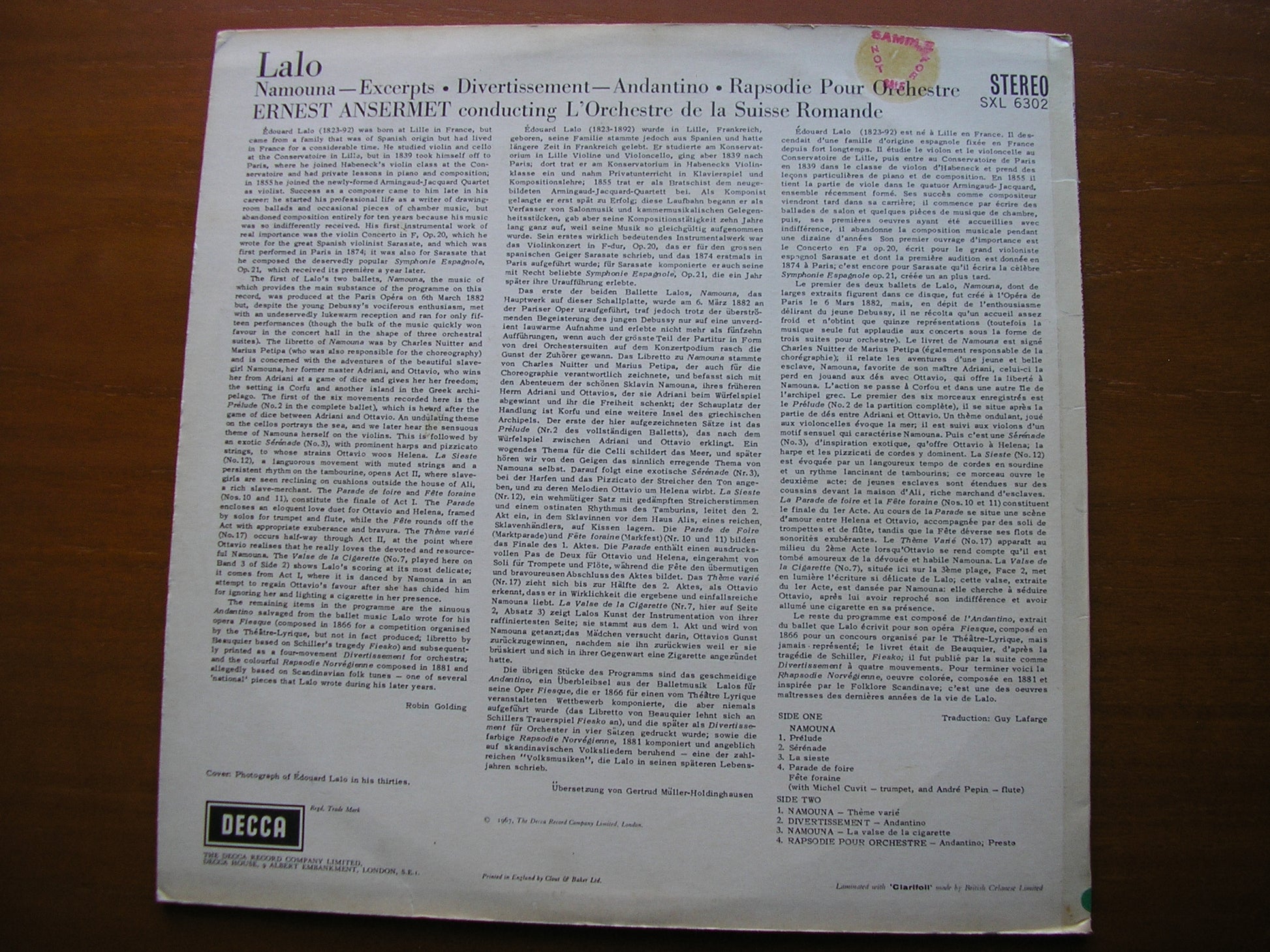 SXL 6302  LALO: NAMOUNA / DIVETISSEMENT / RAPSODIE     ERNEST ANSERMET / SUISSE ROMANDE ORCHESTRA