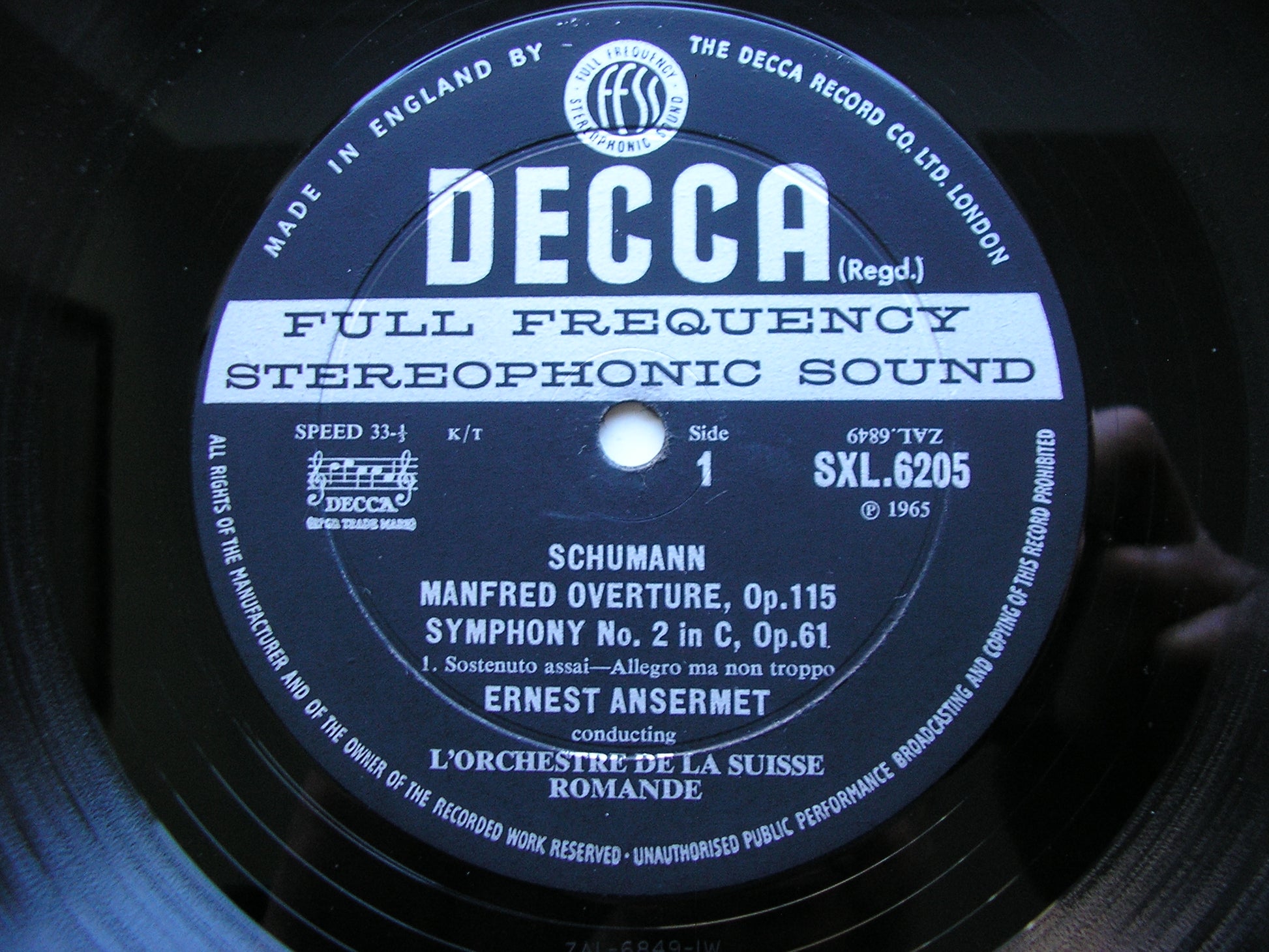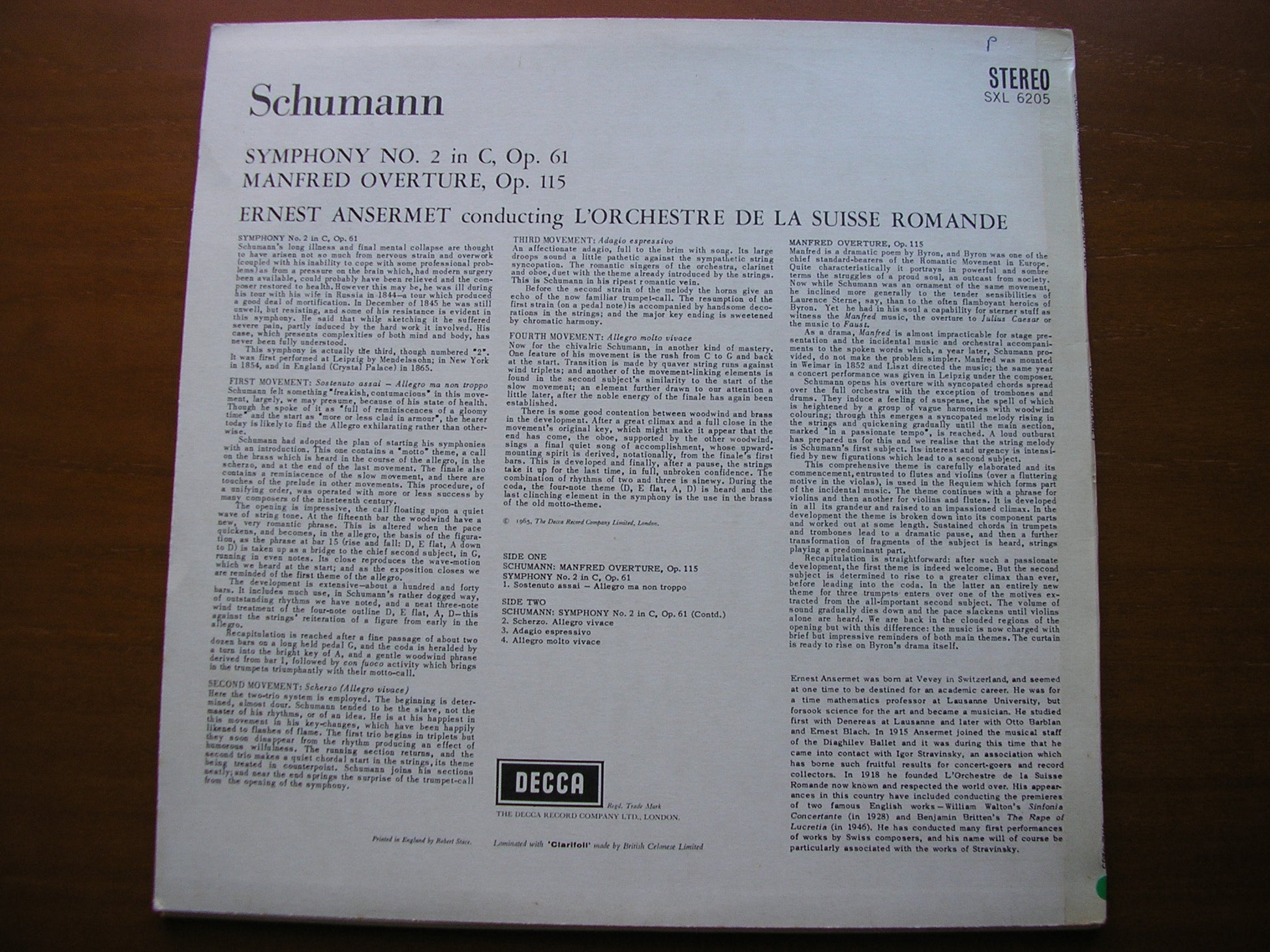 SXL 6205  SCHUMANN: SYMPHONY No. 2 / MANFRED OVERTURE     ERNEST ANSERMET / SUISSE ROMANDE ORCHESTRA