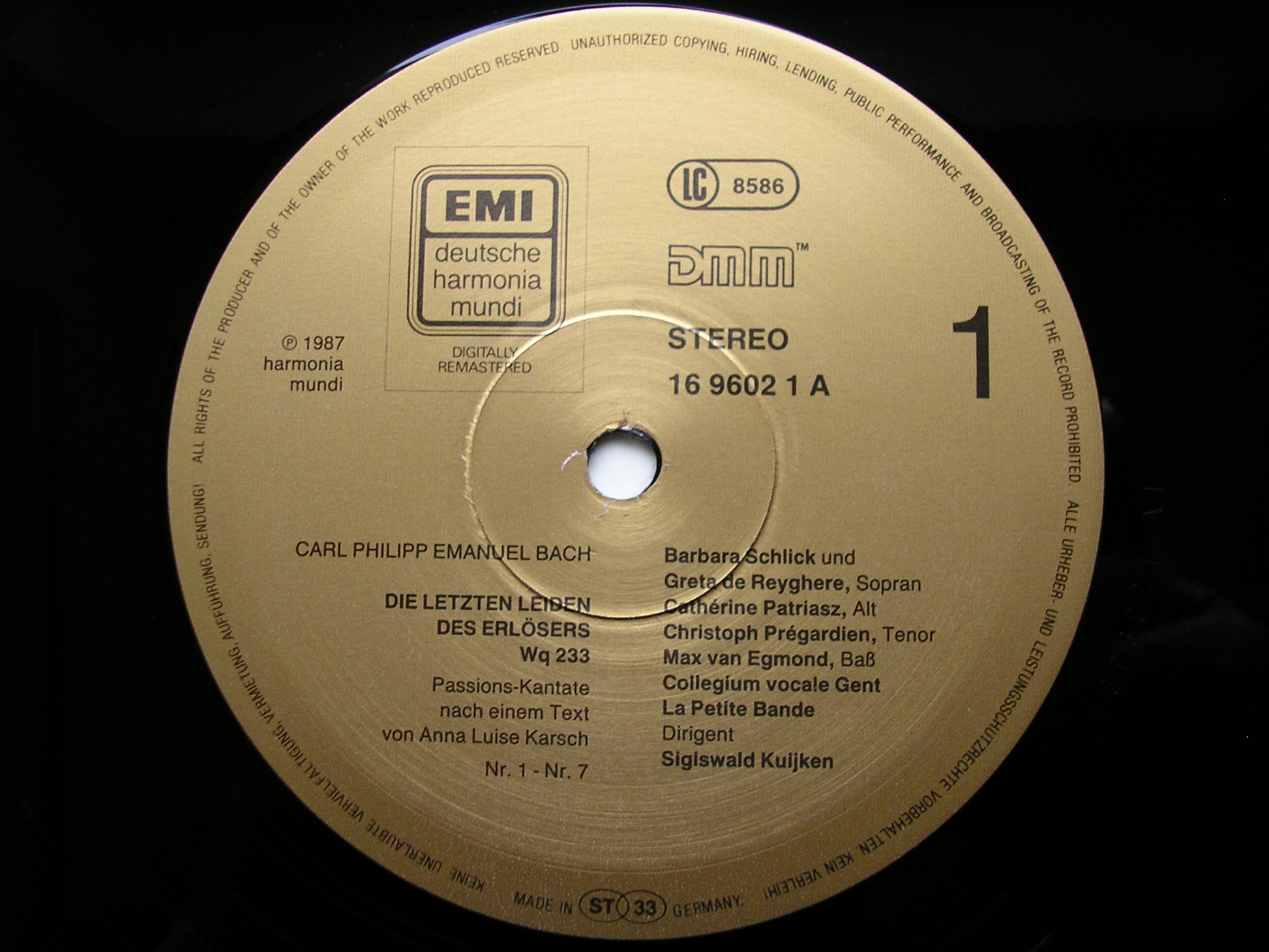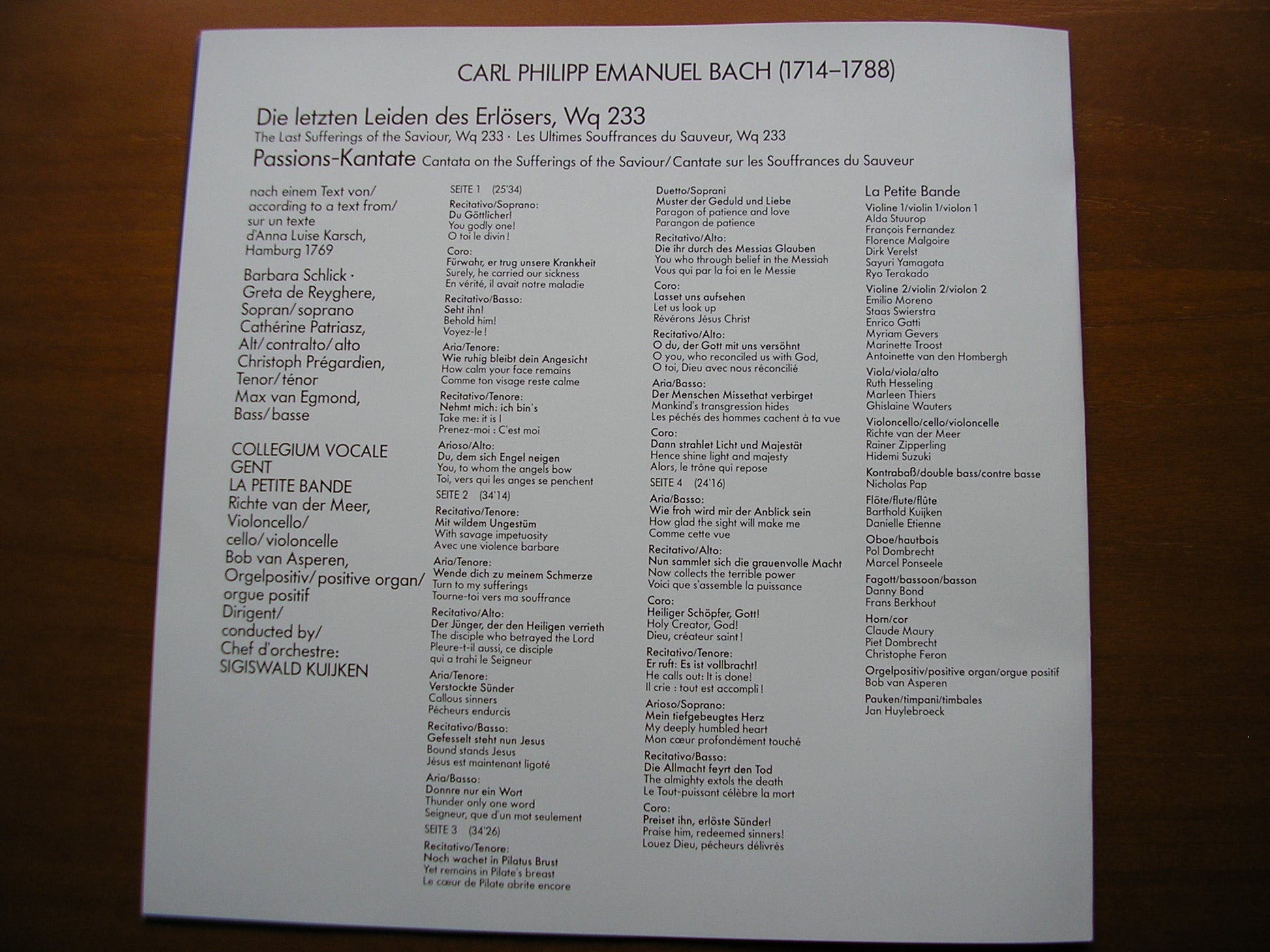 16 9602  CPE BACH: DIE LETZEN LEIDEN DES ERLOSES  Wq 233       SOLOISTS / LA PETITE BAND / SIGISWALD KUIJKEN