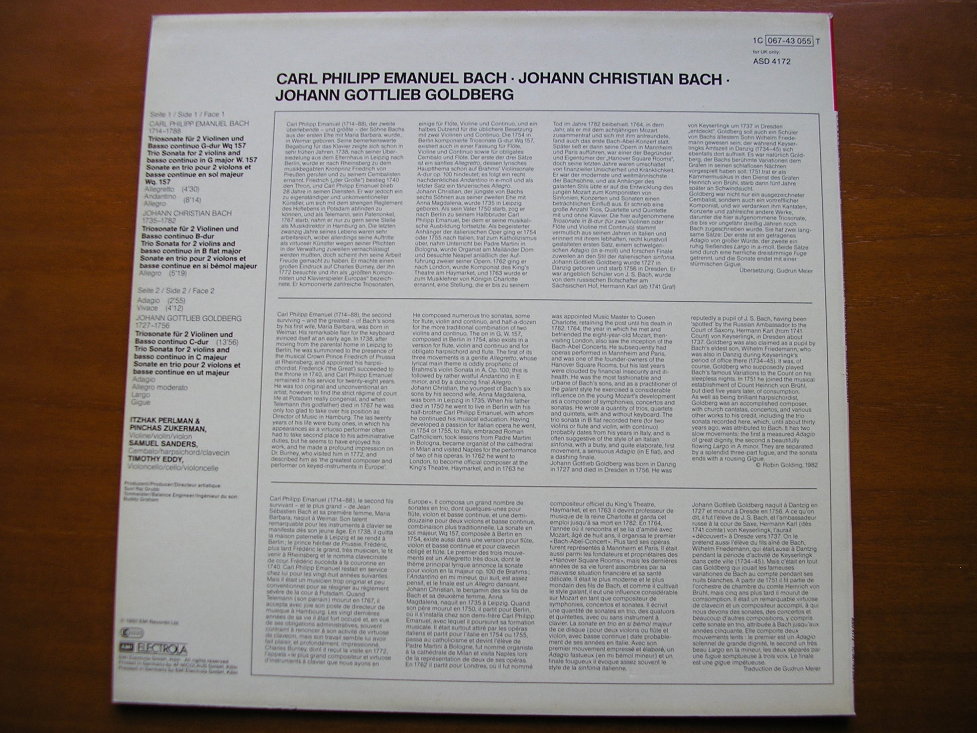 ASD 4172  BACH JC / BACH CPE / GOLDBERG: TRIO SONATAS     ITZHAK PERLMAN / PINCHAS ZUKERMAN / TIMOTHY EDDY / SAMUEL SANDERS