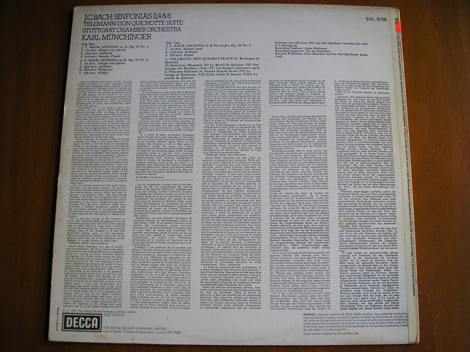SXL 6755  BACH JC: THREE SINFONIAS Op. 18 / TELEMANN: DON QUICHOTTE Suite      KARL MUNCHINGER / STUTTGART CHAMBER ORCHESTRA