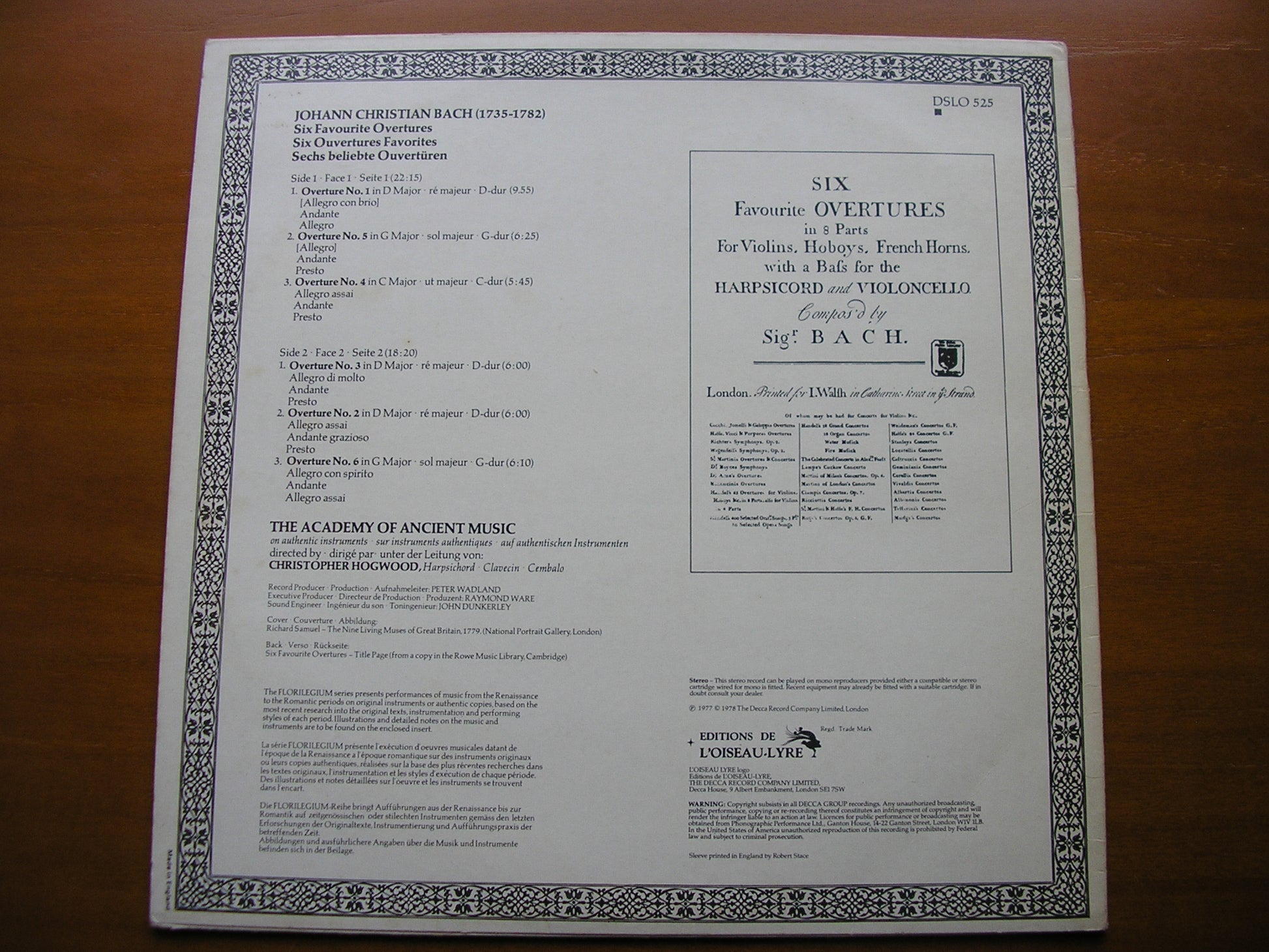 DSLO 525  BACH, JC: SIX FAVOURITE OVERTURES     CHRISTOPHER HOGWOOD / ACADEMY OF ANCIENT MUSIC