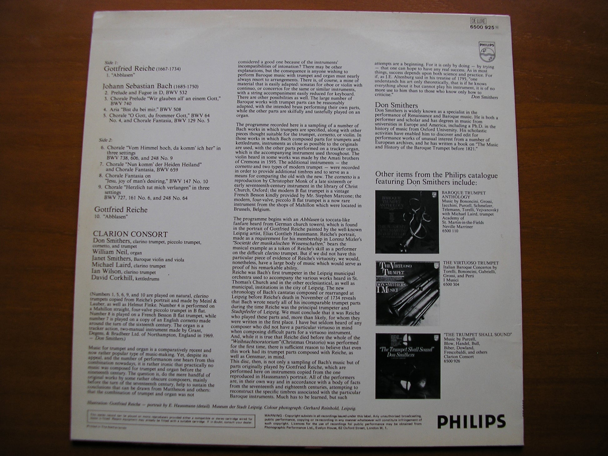 6500 925  BACH'S TRUMPET: Music by Bach & Reiche performed on four different instruments - clarino trumpet / piccolo trumpet / cornetto / trumpet   DON SMITHERS / CLARION CONSORT / WILLIAM NEIL, organ