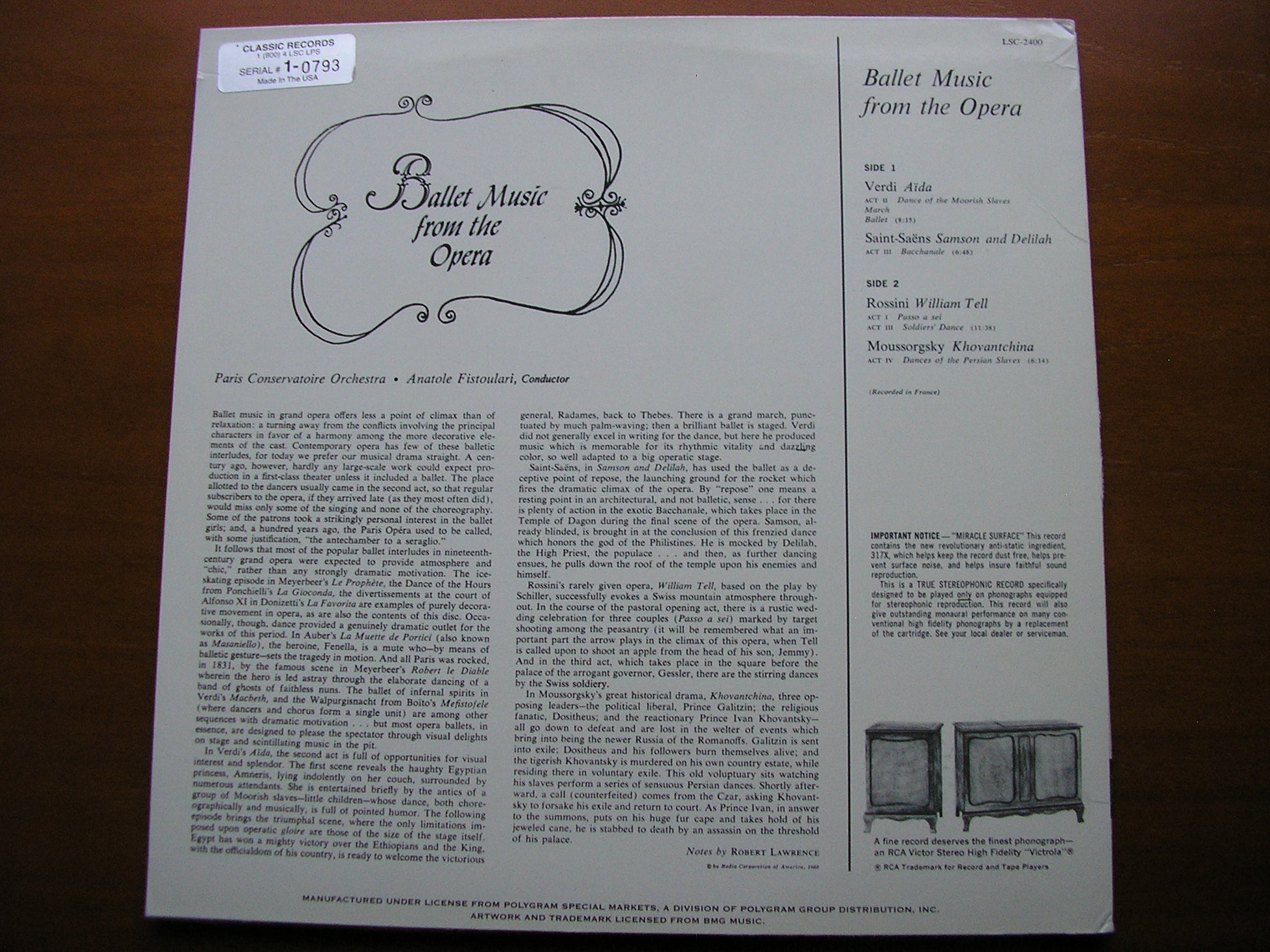 LSC 2400  ROSSINI William Tell / VERDI Aida / MUSSORGSKY Khovantchina / SAINT-SAENS Samson & Delilah      ANATOLE FISTOULARI / PARIS CONSERVATOIRE ORCHESTRA