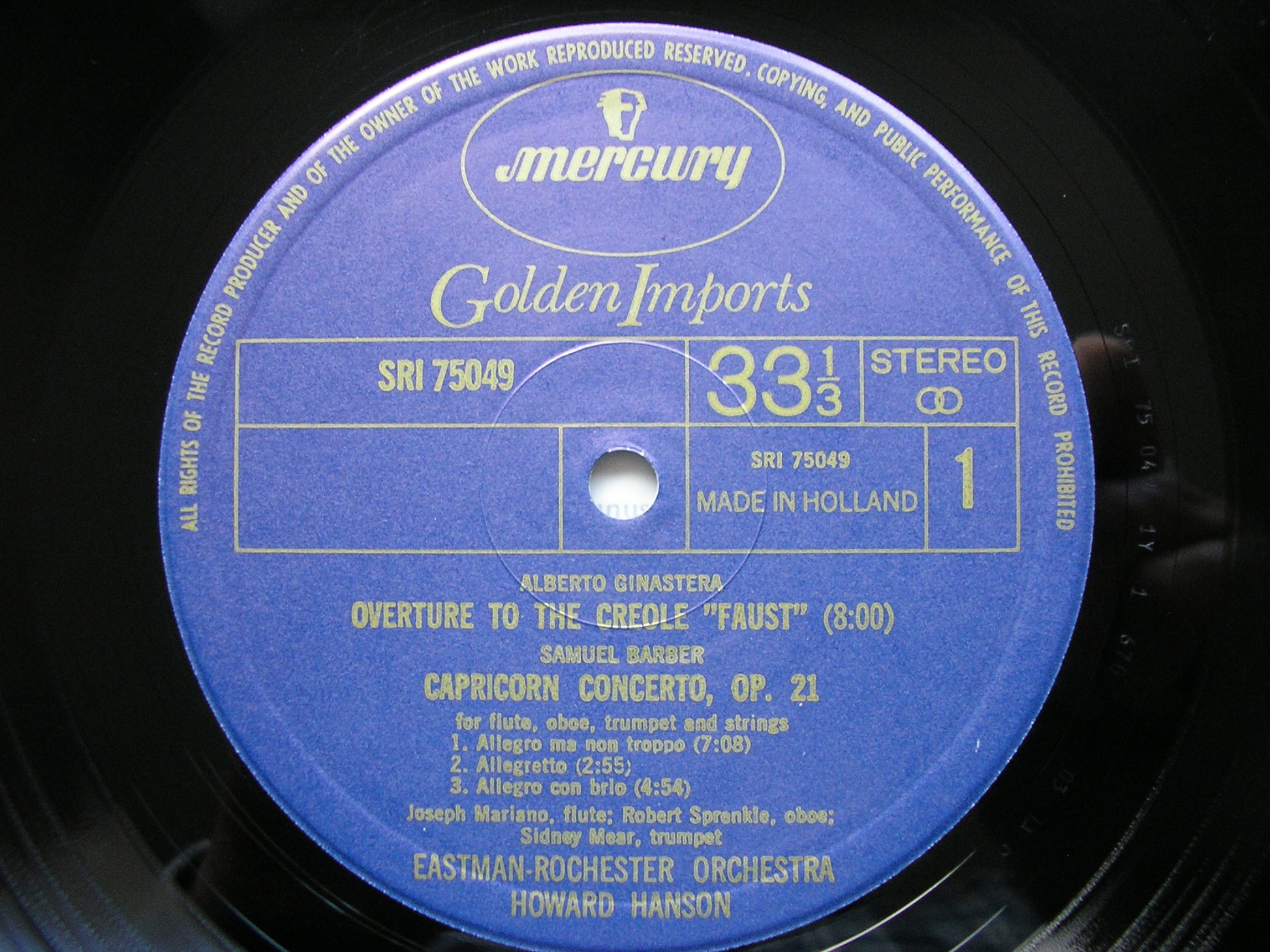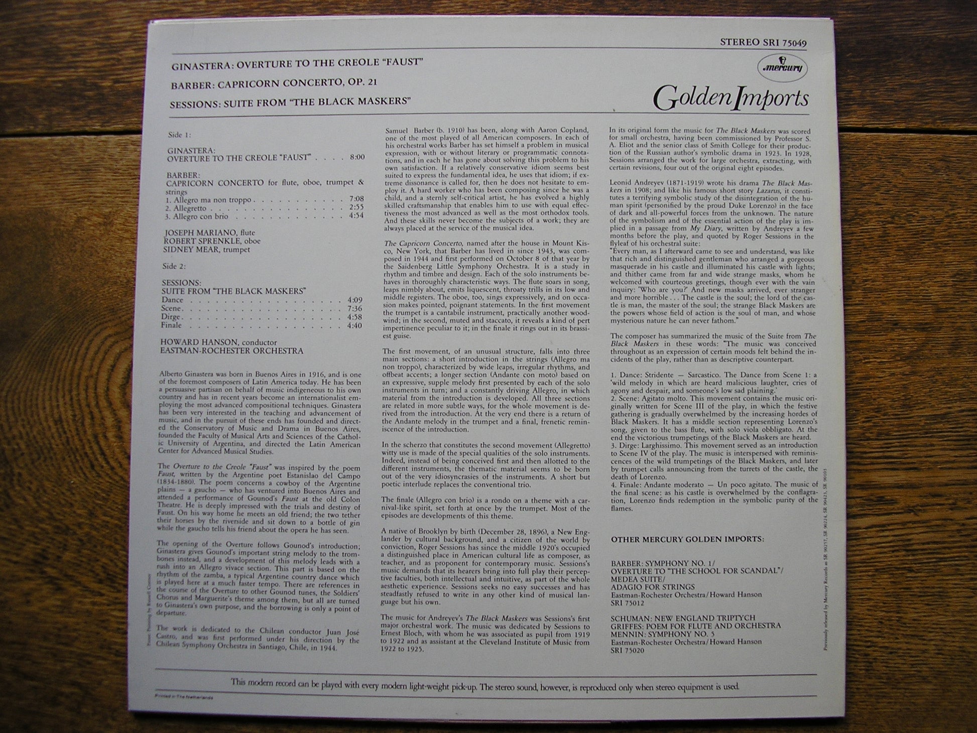 SRI 75049  BARBER: CAPRICORN CONCERTO / GINASTERA: OVERTURE TO THE CREOLE 'FAUST' / SESSIONS: SUITE FROM 'THE BLACK MASKERS'   HOWARD HANSON / EASTMAN - ROCHESTER ORCHESTRA