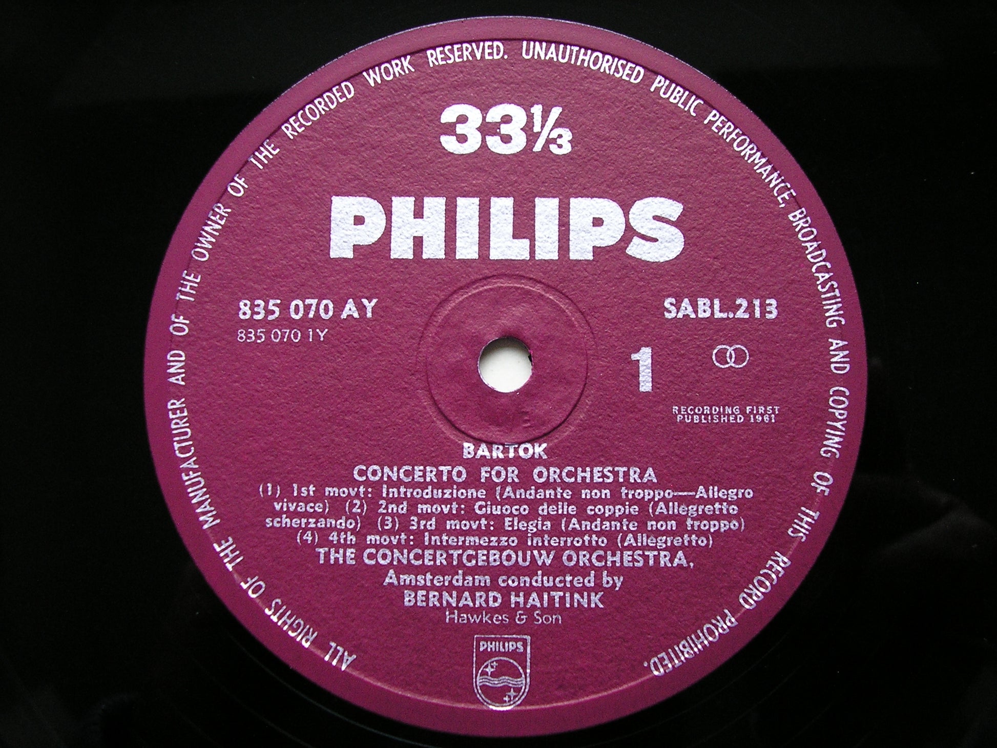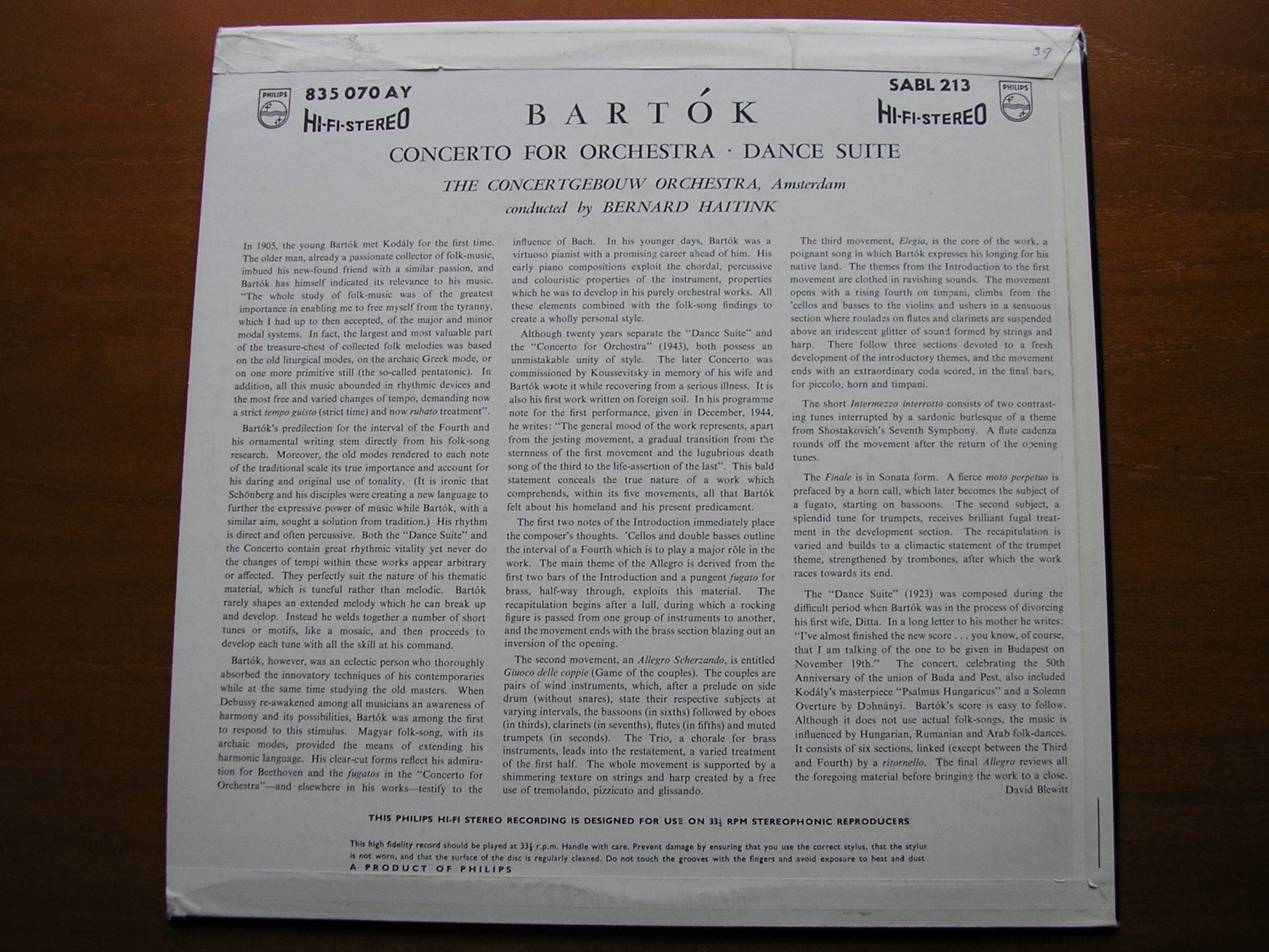 SABL 213 BARTOK: CONCERTO FOR ORCHESTRA / DANCE SUITE BERNARD HAITINK / CONCERTGEBOUW ORCHESTRA AMSTERDAM