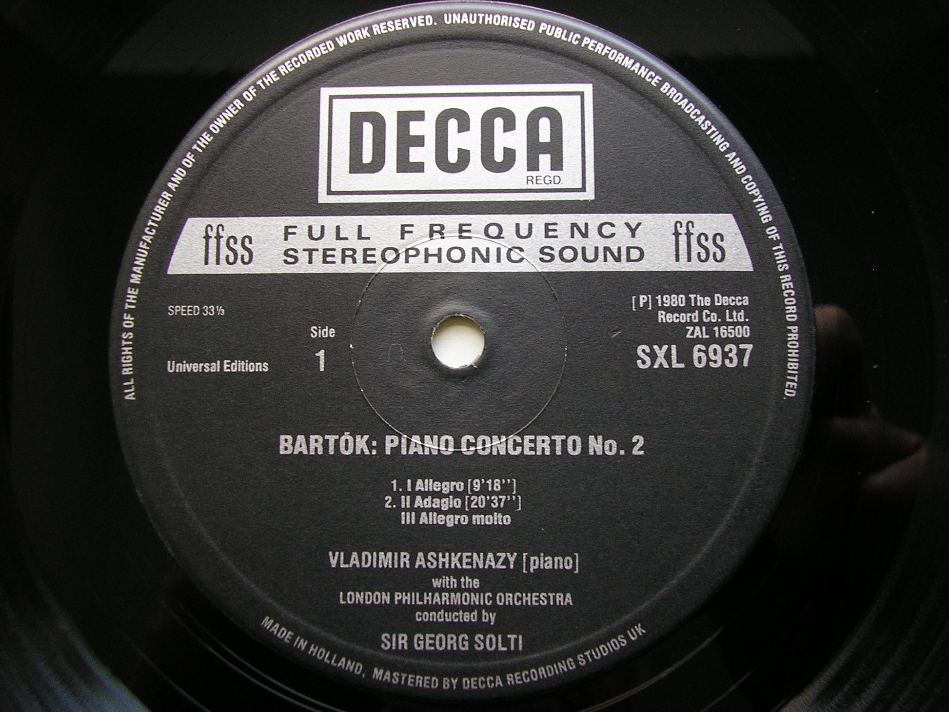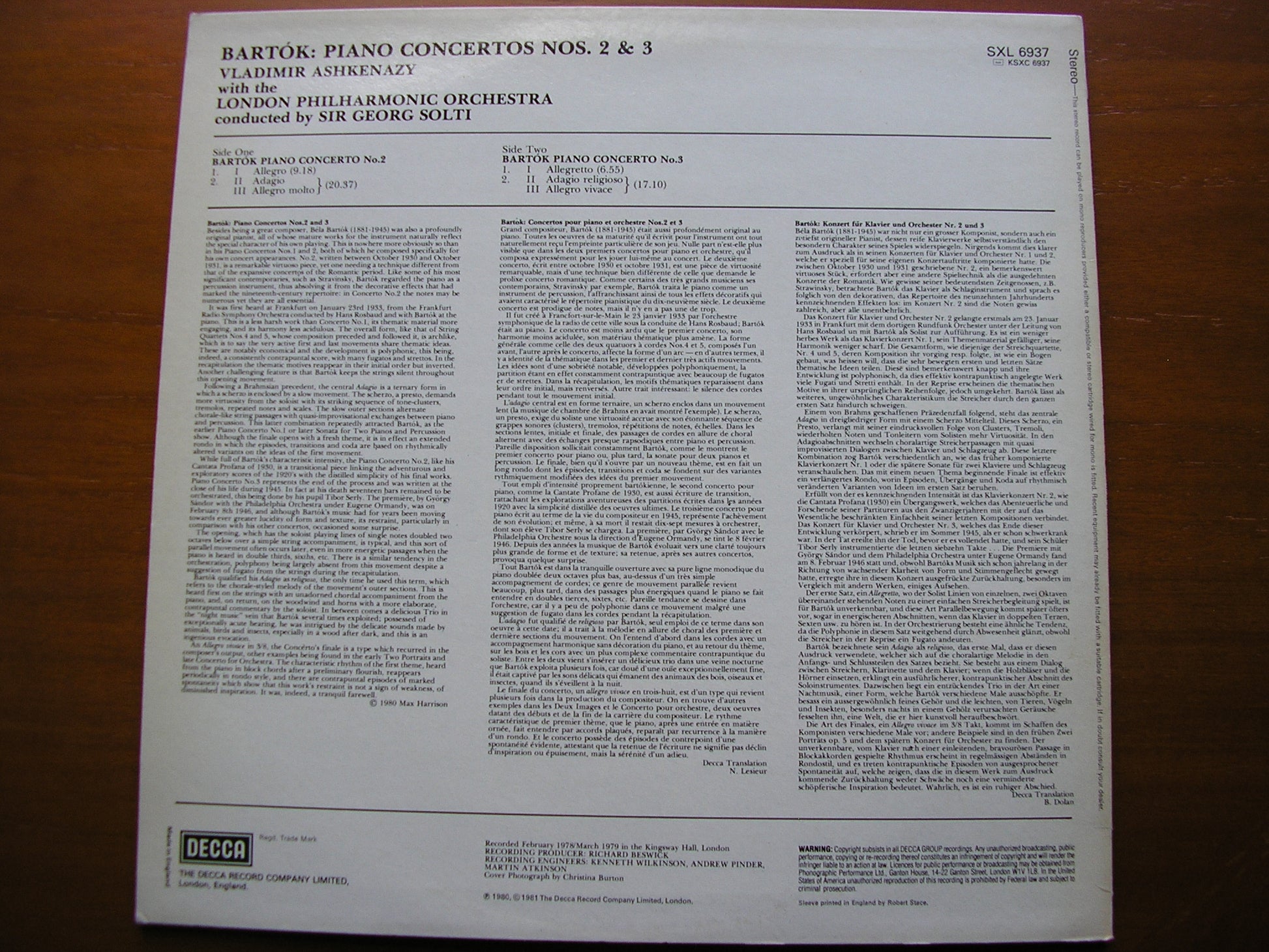 SXL 6937 BARTOK: PIANO CONCERTOS Nos. 2 & 3 VLADIMIR ASHKENAZY / LONDON PHILHARMONIC ORCHESTRA / GEORG SOLTI