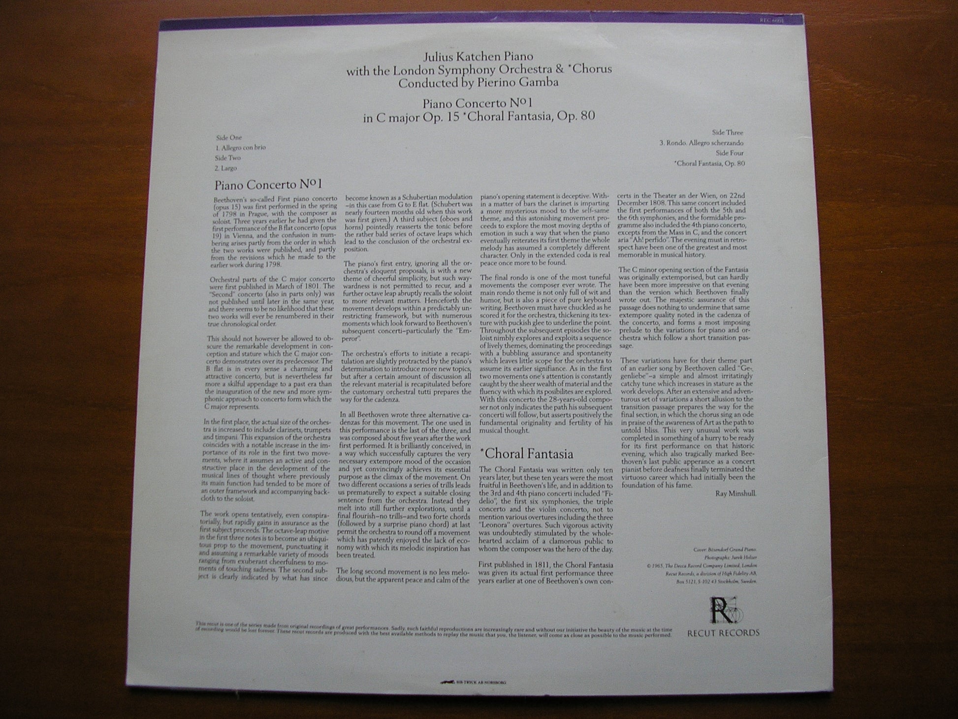 REC 6001  BEETHOVEN: PIANO CONCERTO No. 1 / CHORAL FANTASIA    JULIUS KATCHEN / LONDON SYMPHONY ORCHESTRA / PIERINO GAMBA