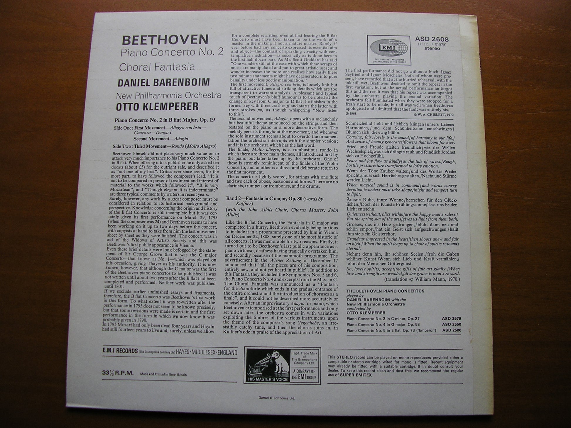 BEETHOVEN: PIANO CONCERTO No. 2 / CHORAL FANTASIA BARENBOIM / NEW PHILHARMONIA / OTTO KLEMPERER ASD 2608