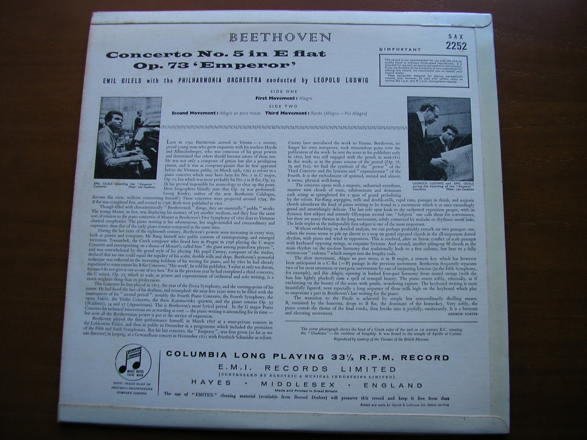 SAX 2252 BEETHOVEN: PIANO CONCERTO No. 5 'Emperor' GILELS / PHILHARMONIA / LUDWIG