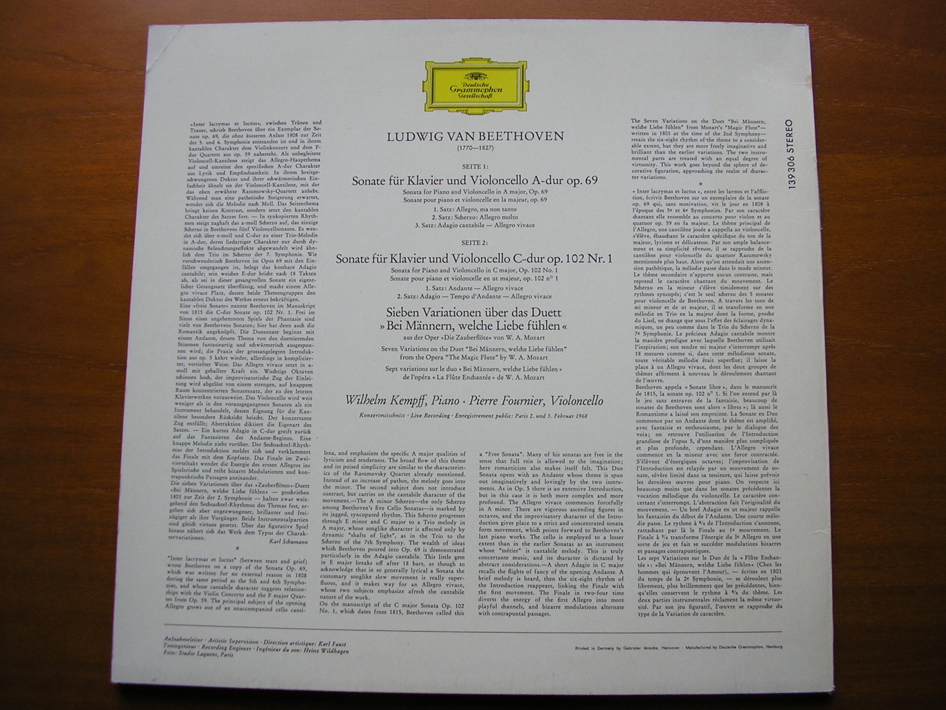 139 306  BEETHOVEN: SONATAS FOR PIANO & CELLO in A Op. 69 / in C Op. 102 / SEVEN VARIATIONS ON MOZART'S 'Bei Mannern'    WILHELM KEMPFF / PIERRE FOURNIER