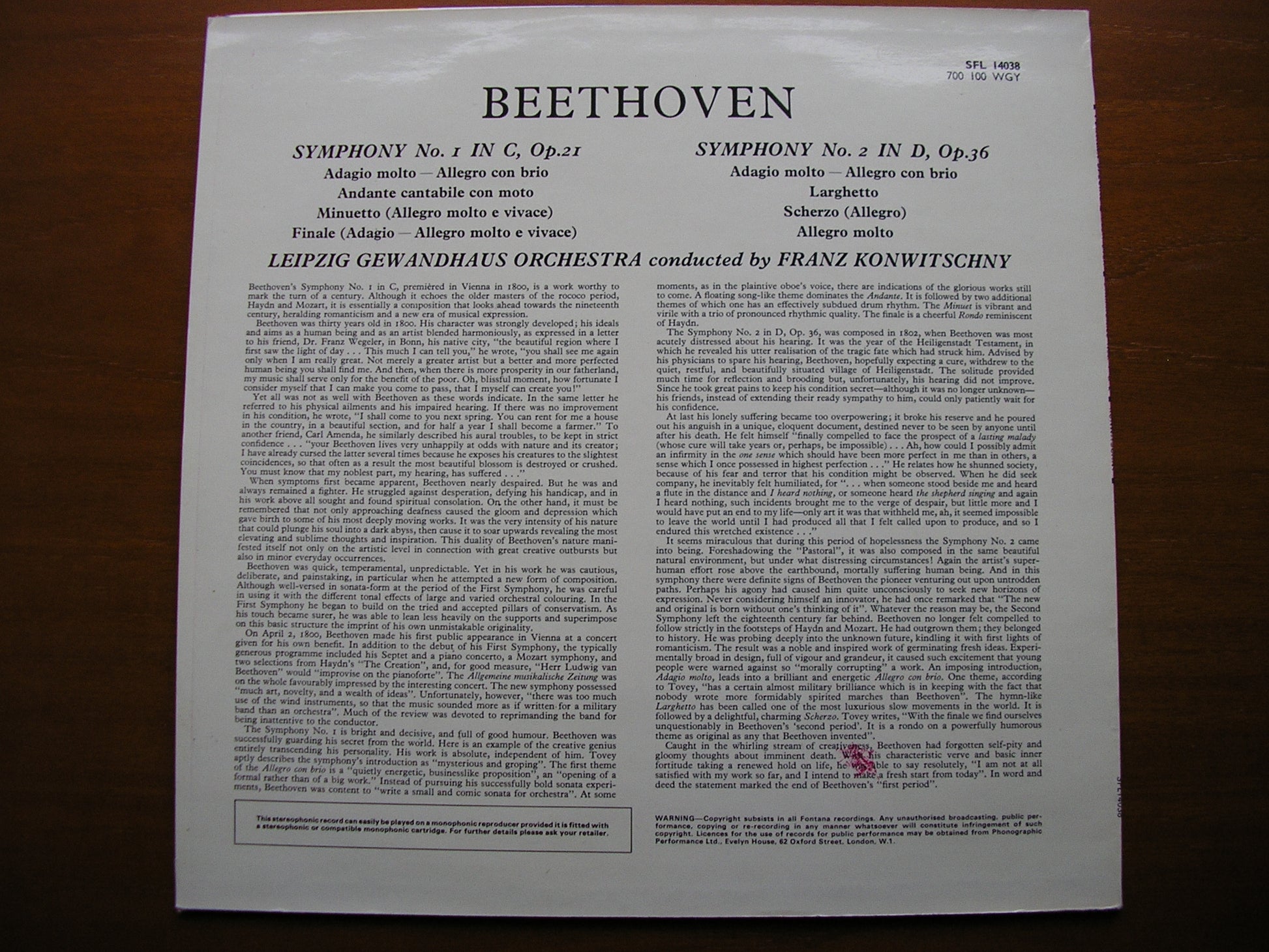 SFL 14038  BEETHOVEN: SYMPHONIES Nos. 1 & 2    FRANZ KONWITSCHNY / LEIPZIG GEWANDHAUS ORCHESTRA