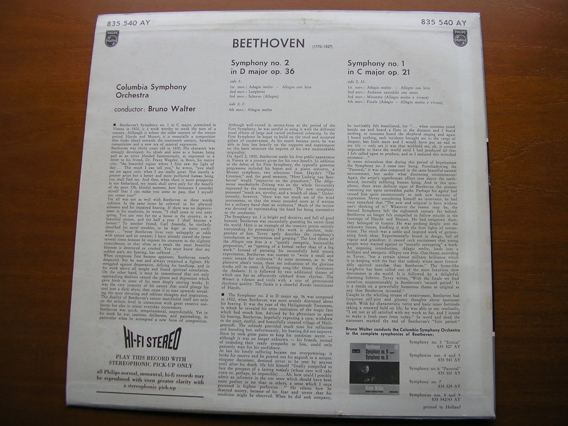 835 540 AY  BEETHOVEN: SYMPHONIES Nos. 1 & 2      BRUNO WALTER / COLUMBIA SYMPHONY ORCHESTRA
