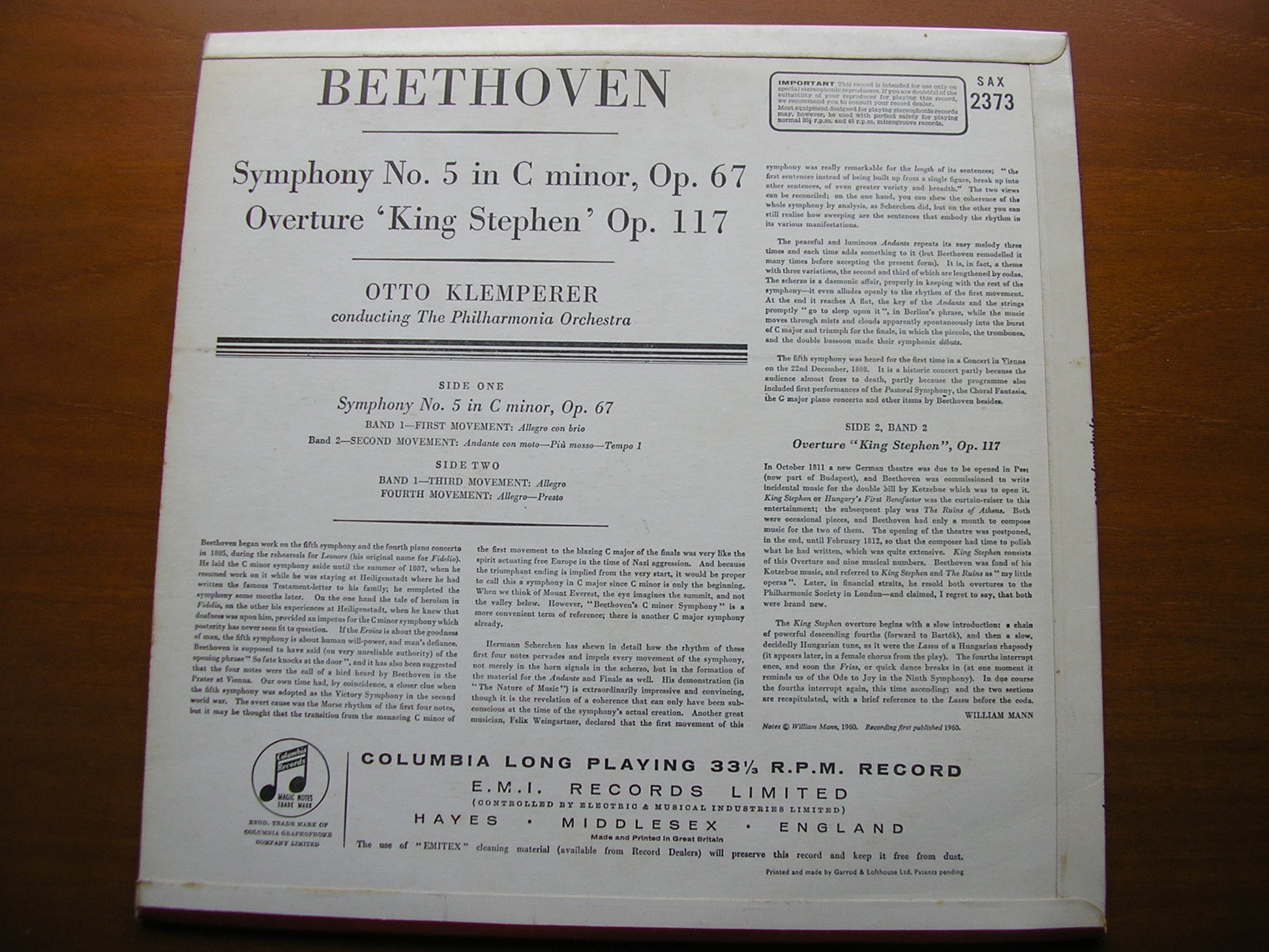 SAX 2373  BEETHOVEN: SYMPHONY No. 5 / OVERTURE King Stephen    OTTO KLEMPERER / PHILHARMONIA ORCHESTRA