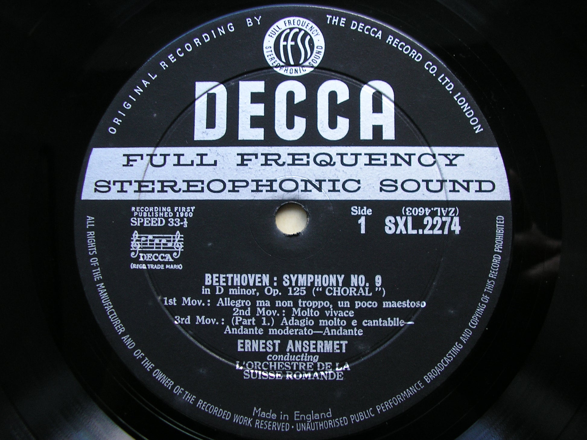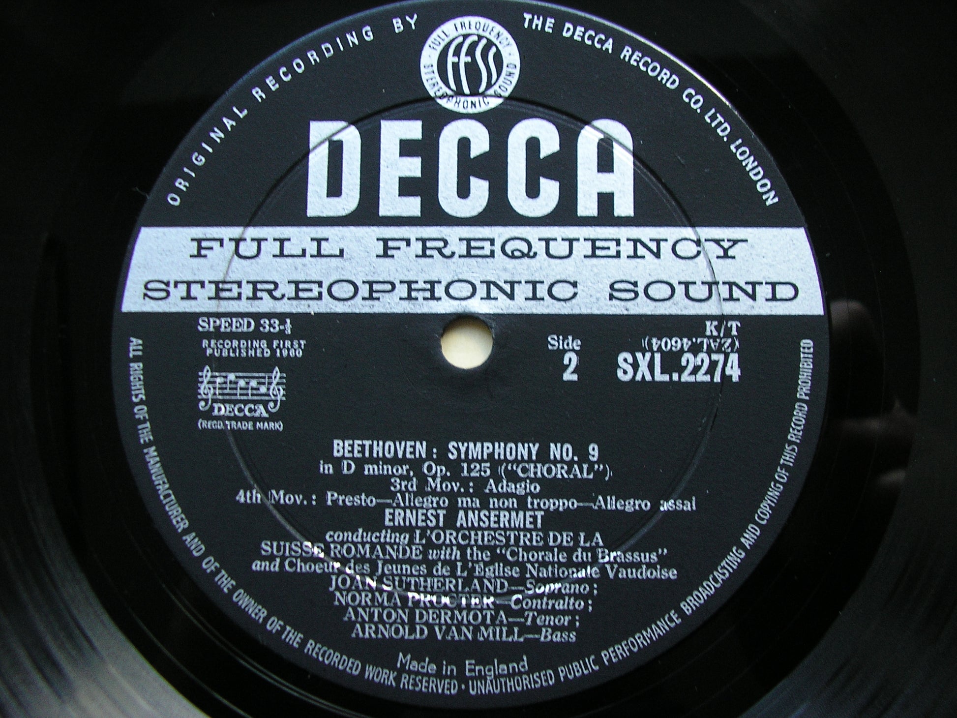 SXL 2274  BEETHOVEN: SYMPHONY No. 9    JOAN SUTHERLAND / NORMA PROCTER / ANTON DERMOTA / ARNOLD VAN MILL / SUISSE ROMANDE ORCHESTRA / ERNEST ANSERMET