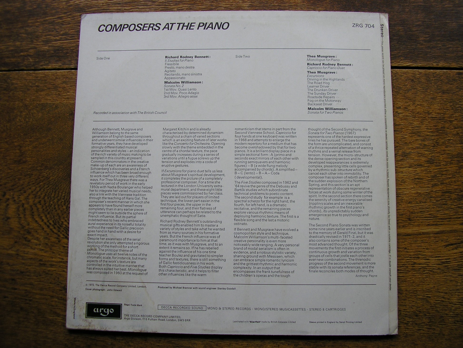 ZRG 704 COMPOSERS AT THE PIANO BENNETT: FIVE STUDIES / CAPRICCIO FOR PIANO DUET / MUSGRAVE: EXCURSIONS / MONLOGUE / WILLIAMSON: SONATA No. 2 / SONATA FOR TWO PIANOS RICHARD RODNEY BENNETT / THEA MUSGRAVE / MALCOLM WILLIAMSON