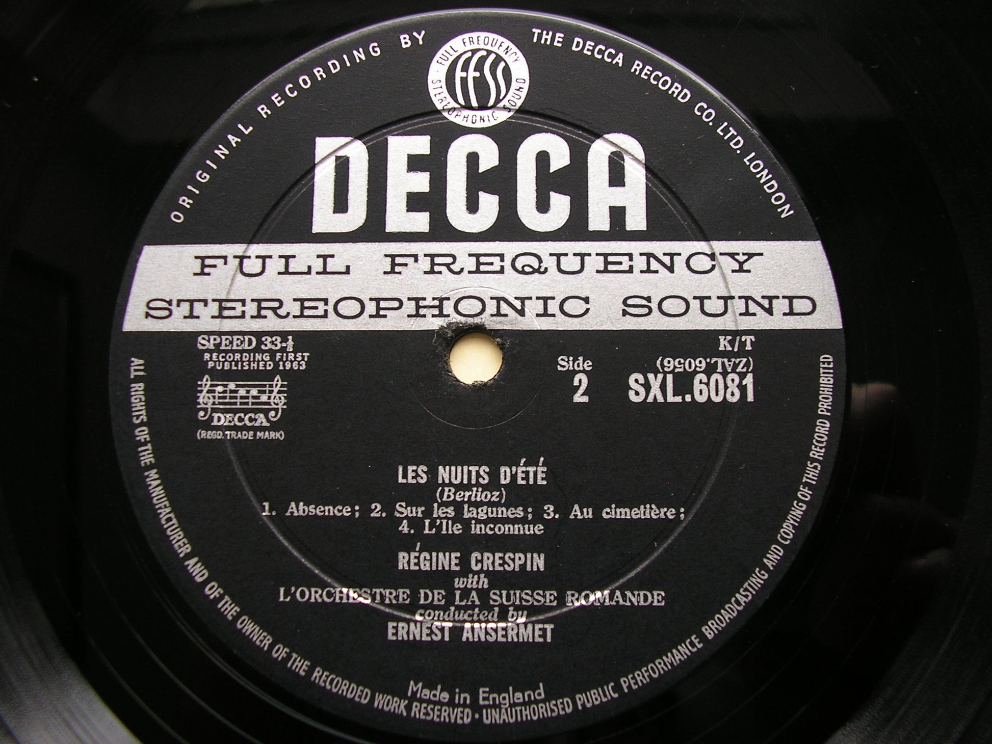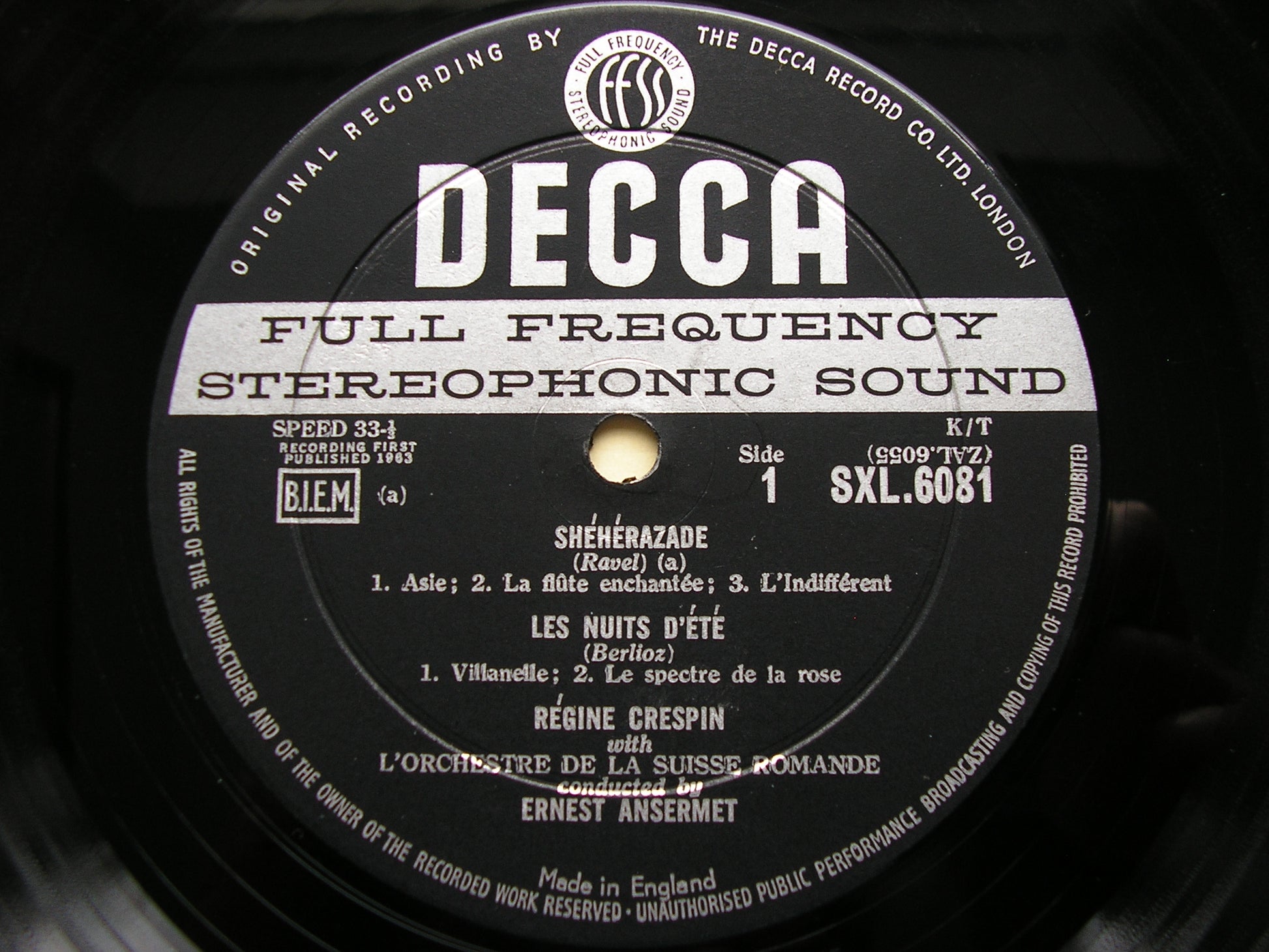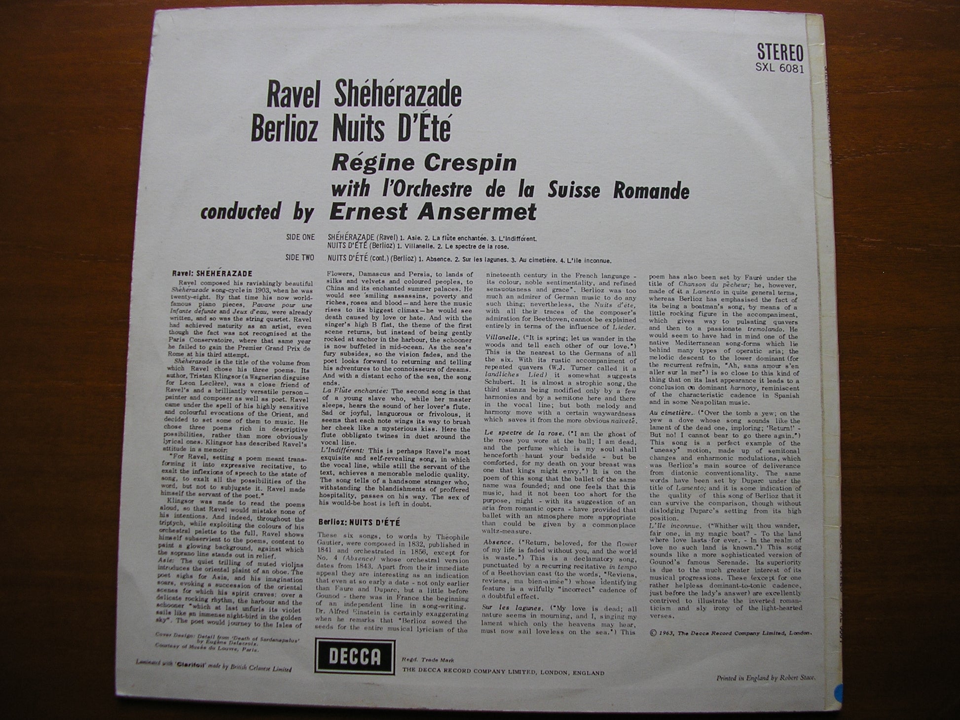 SXL 6081 BERLIOZ: LES NUITS D'ETE / RAVEL: SHEHERAZADE REGINE CRESPIN / SUISSE ROMANDE ORCHESTRA / ERNEST ANSERMET