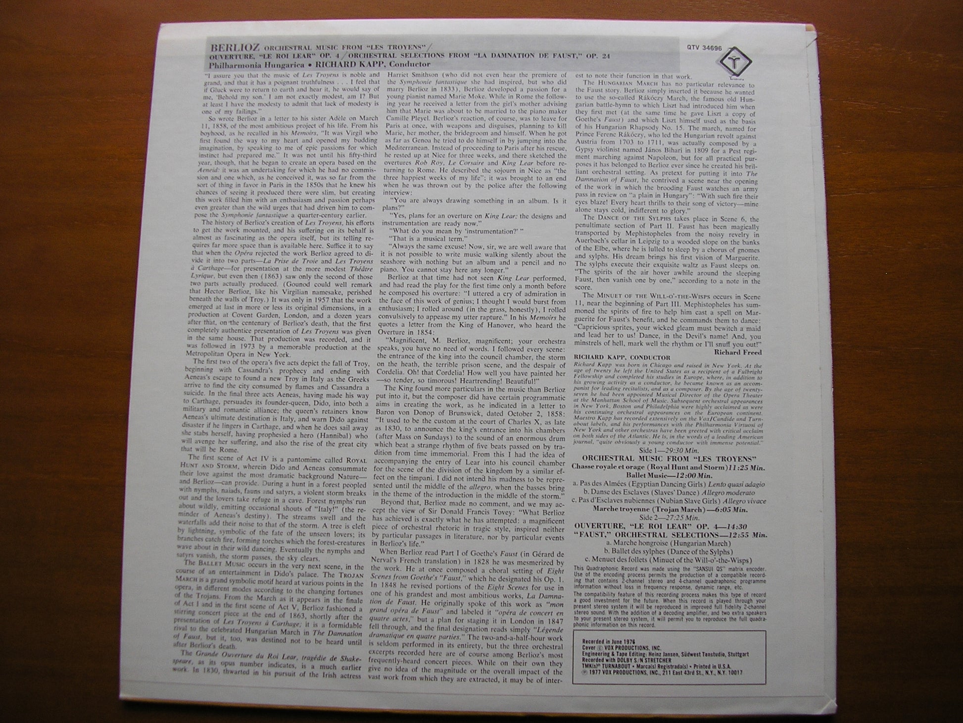 QTV 34696  BERLIOZ: LES TROYENS ballet music / LA DAMNATION DE FAUST  orchestral music / OVERTURE King Lear         RICHARD KAPP / PHILHARMONIA HUNGARICA