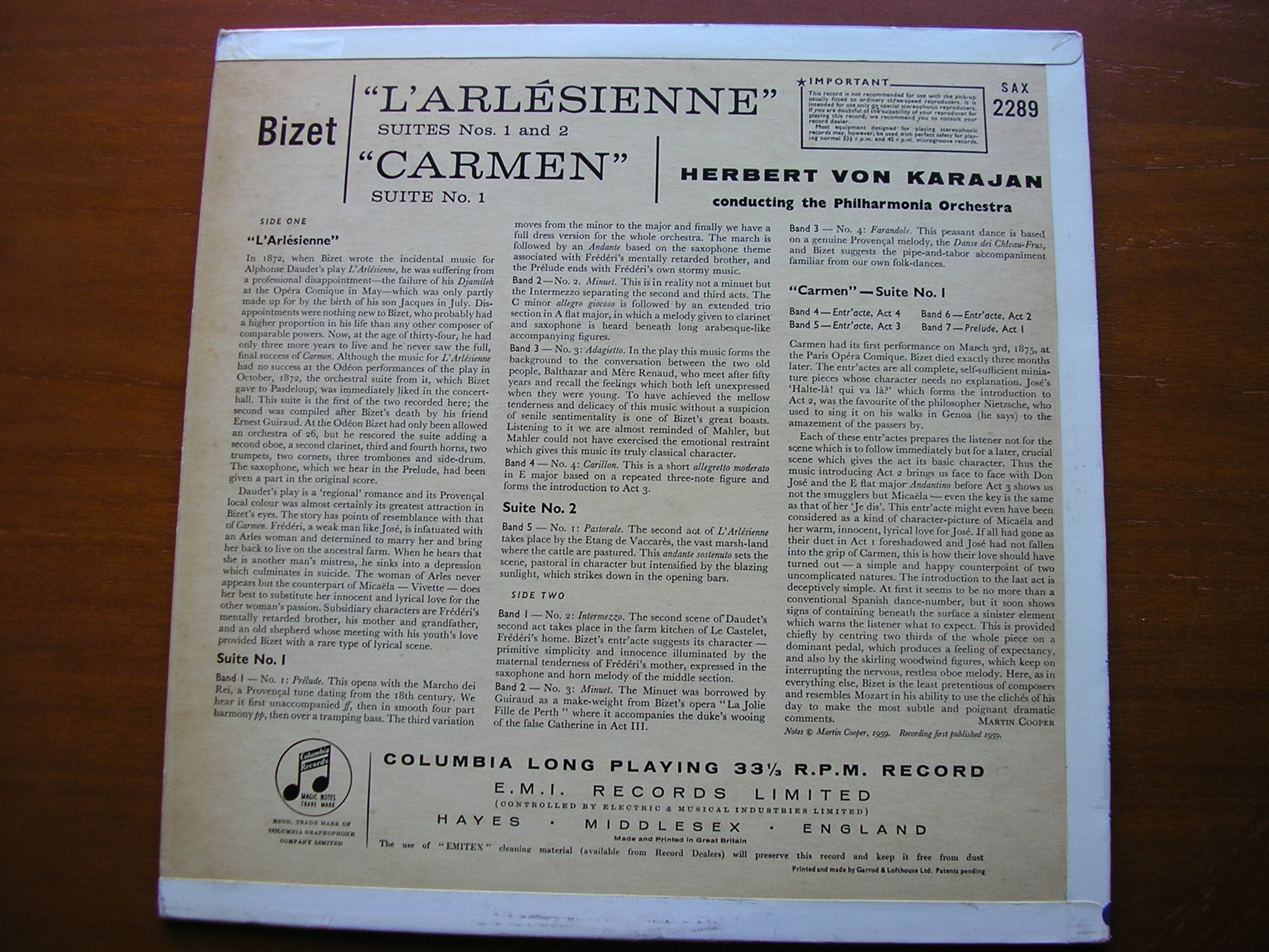 SAX 2289  BIZET: L'ARLESIENNE Suites Nos. 1 & 2 / CARMEN Suite No. 1    HERBERT VON KARAJAN / PHILHARMONIA ORCHESTRA