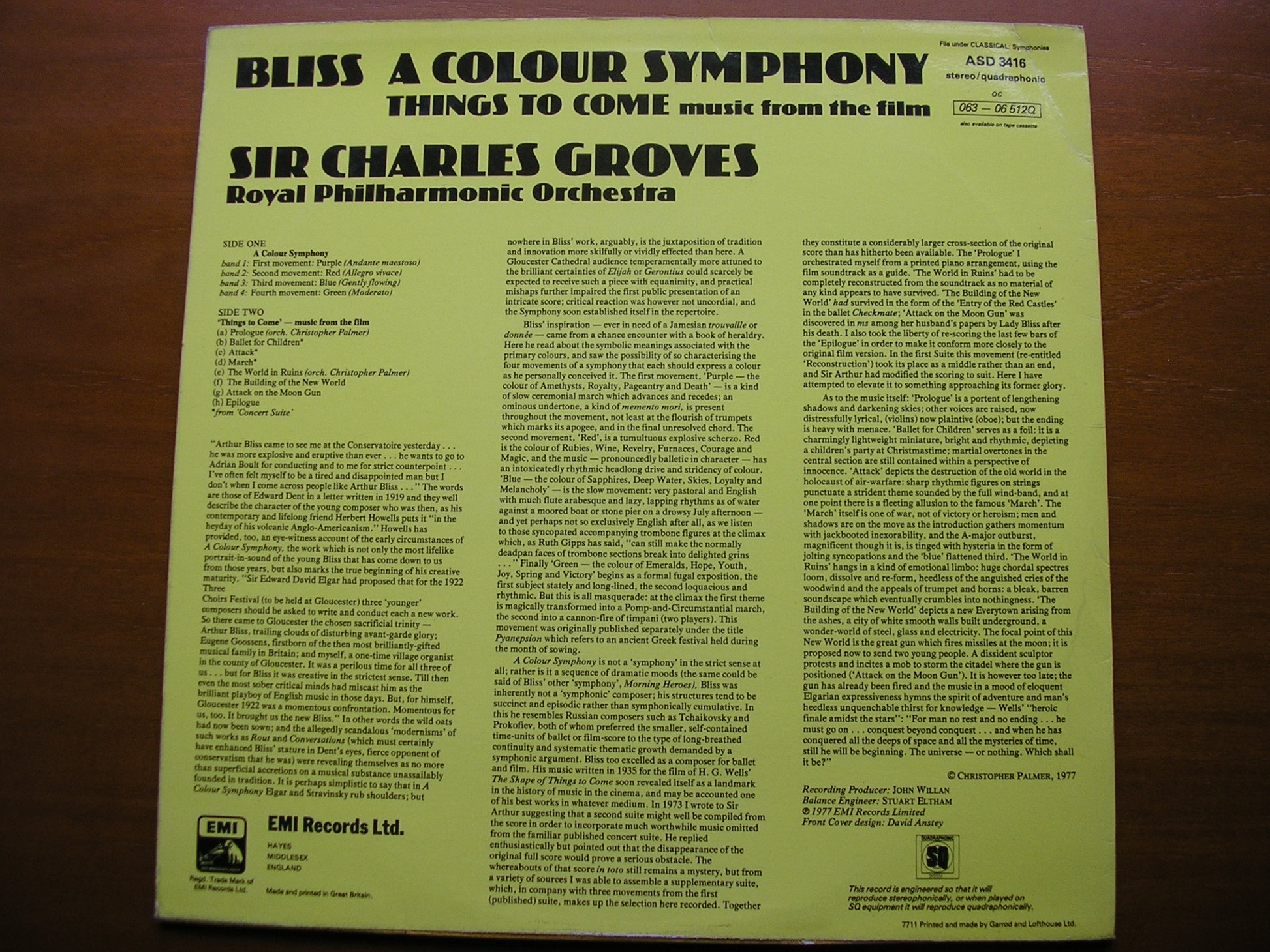 ASD 3416 BLISS: THINGS TO COME / A COLOUR SYMPHONY     SIR CHARLES GROVES / ROYAL PHILHARMONIC ORCHESTRA