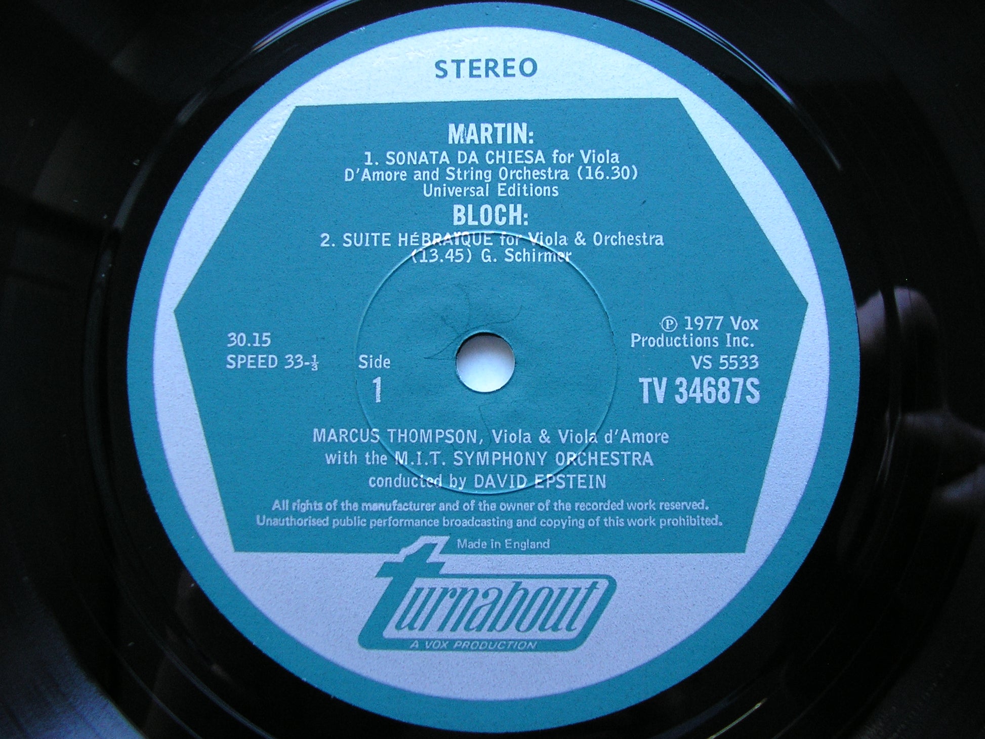 TV 34687S  BLOCH: SUITE HEBRAIQUE FOR VIOLA D'AMORE & ORCHESTRA / PAUL HINDEMITH: DER SCHWANENDREHER / MARTIN: SONATA DA CHIESA MARCUS THOMPSON / M.I.T SYMPHONY ORCHESTRA / DAVID EPSTEIN
