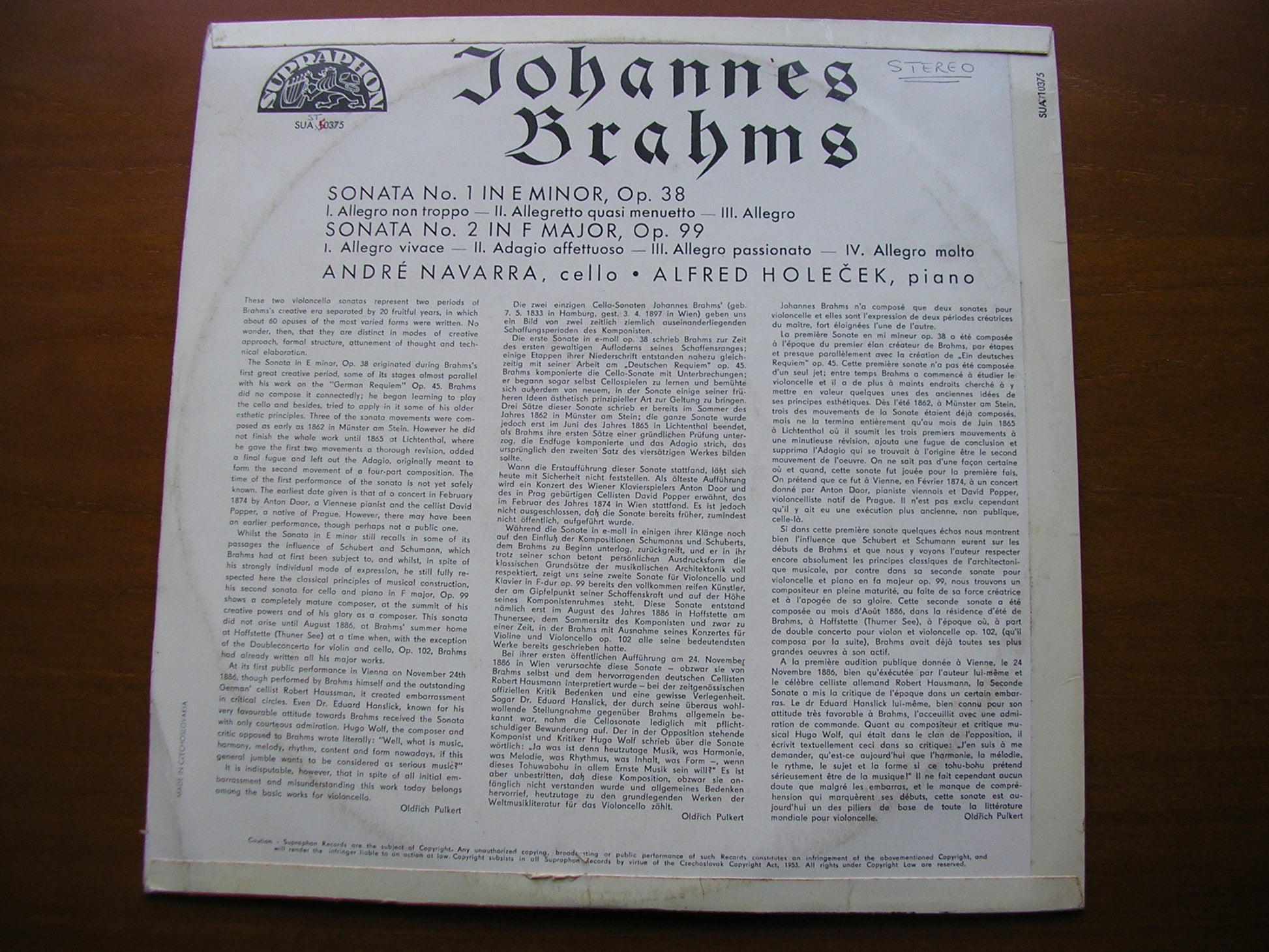 SUA ST 50375  BRAHMS: CELLO SONATAS Nos. 1 & 2        ANDRE NAVARRA / ALFRED HOLECEK